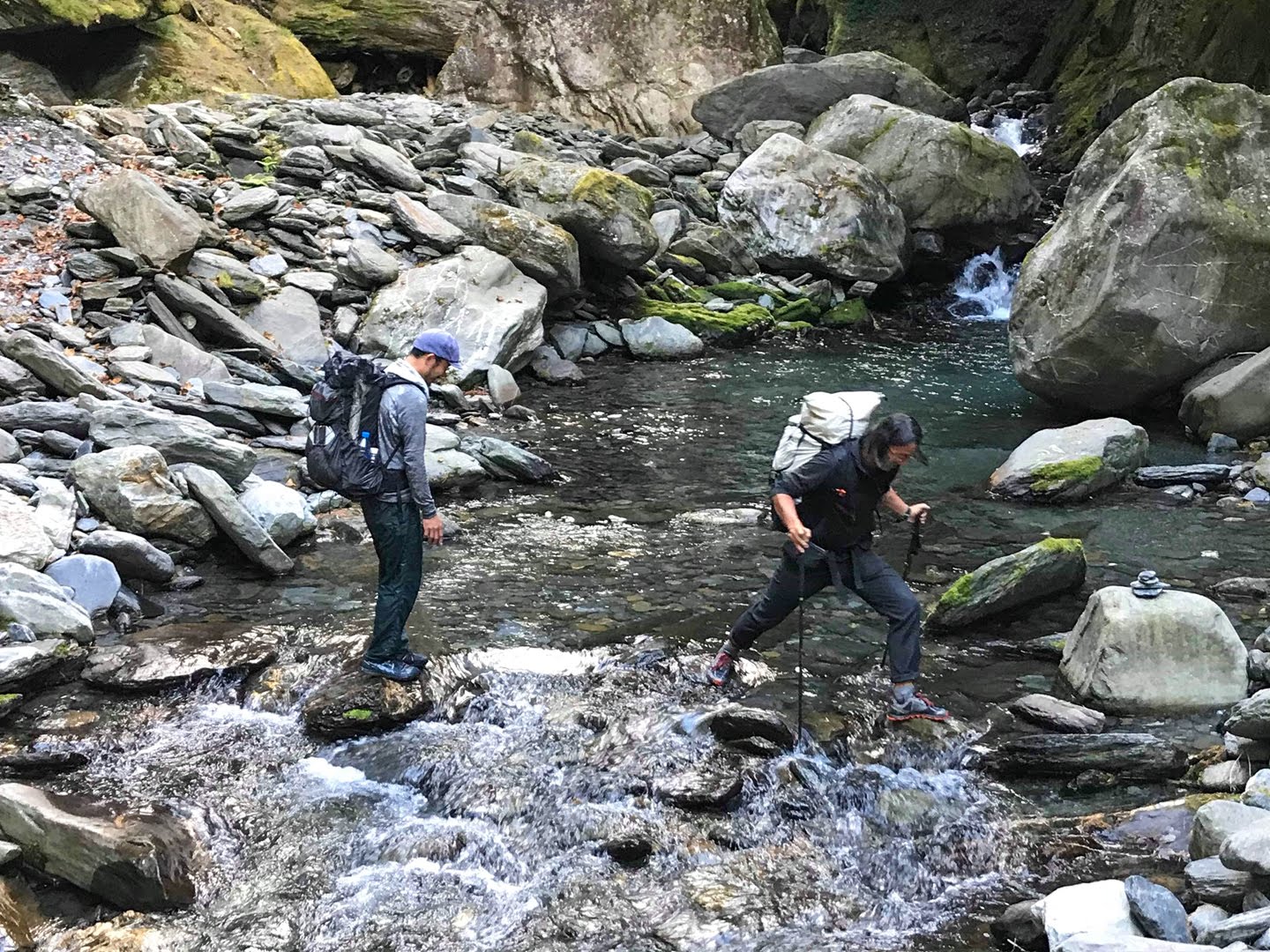 中央尖渓山屋から下流域は降雨量が多いと、入渓できないぐらいの川幅になるのだろう。苔や不安定な足場、流された大きな倒木たちが物語っている。1年を通しても、自分たちは恵まれた環境に入山しているのだと、そのとき改めて思った。