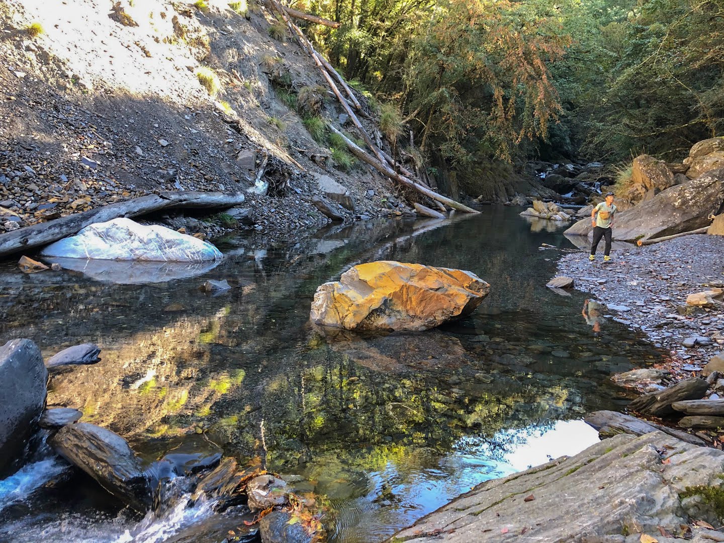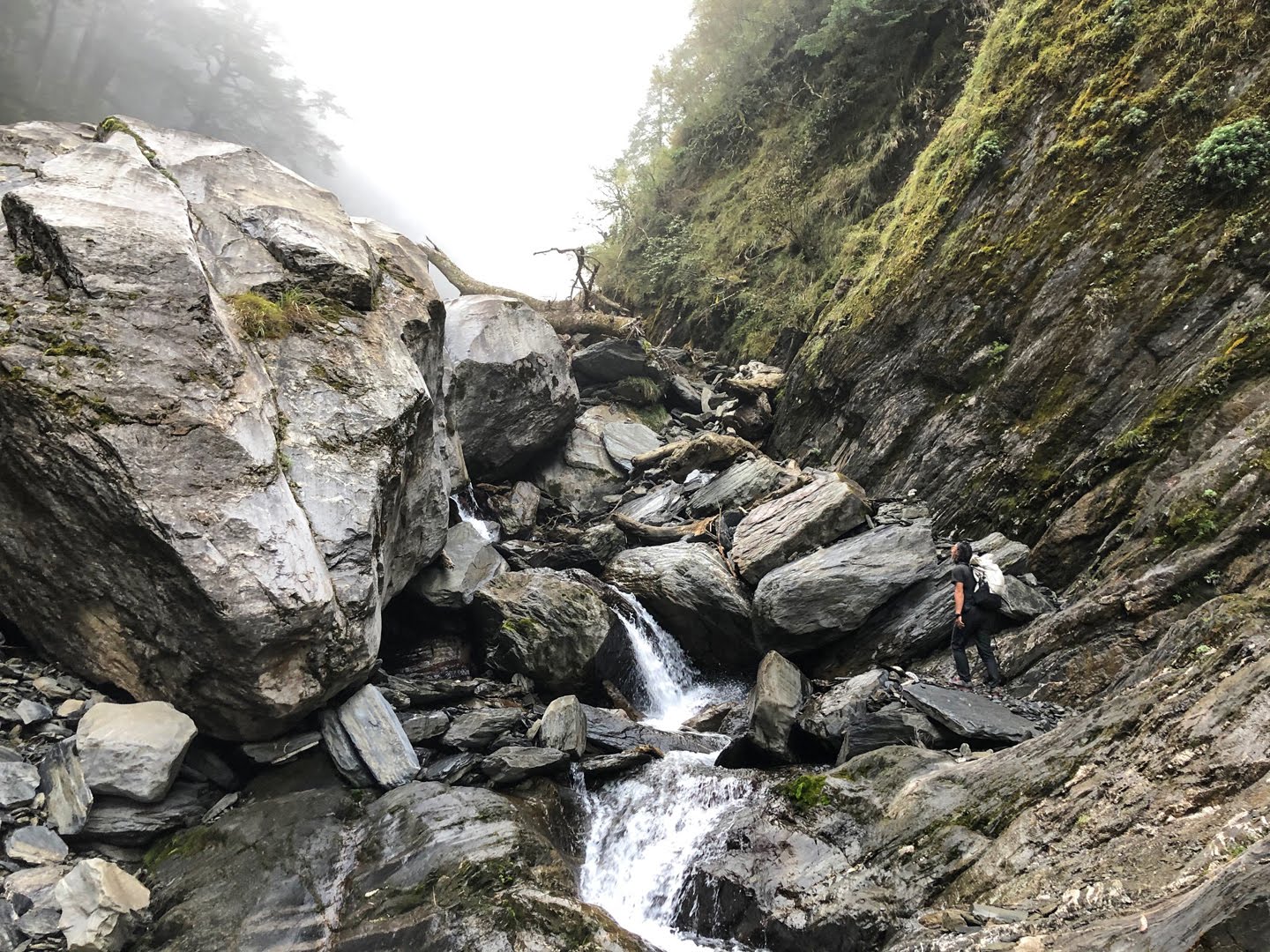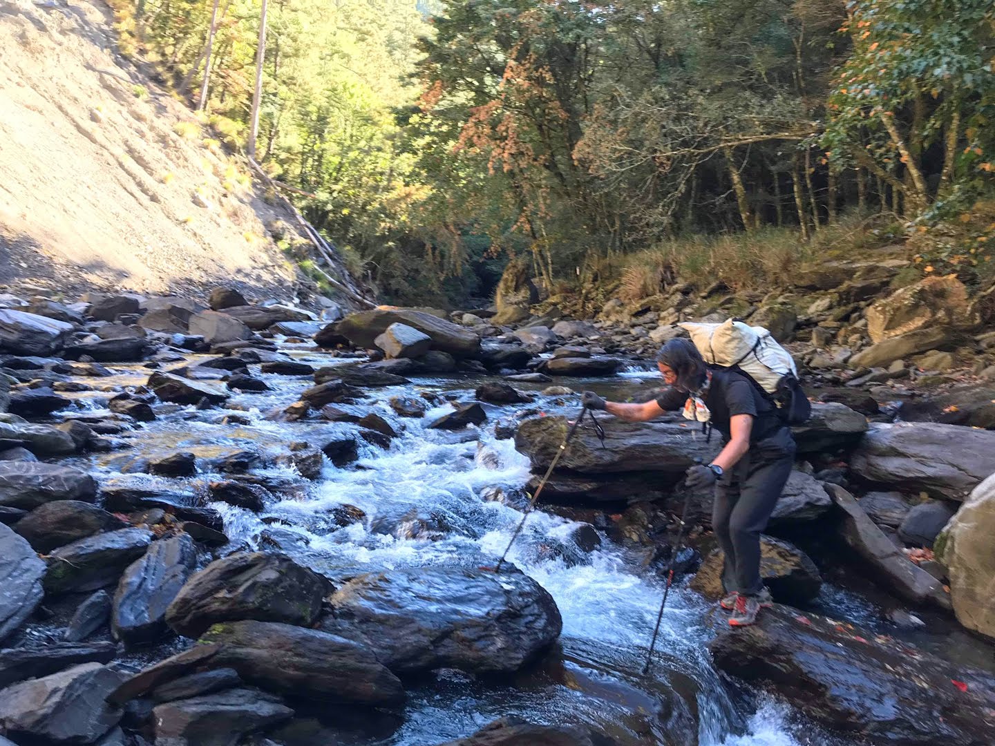 みんなで渡渉箇所を見極めながら、恐る恐るこなしていくセクションが長く続く中、またやってしまった。滑った浮石にジャンプして、右半身ドボンしてしまったのだ。標高こそ下げているが、16時を過ぎて、山間は陽が沈む直前、気温が低くなり始めていたので、正直辛いところだった。