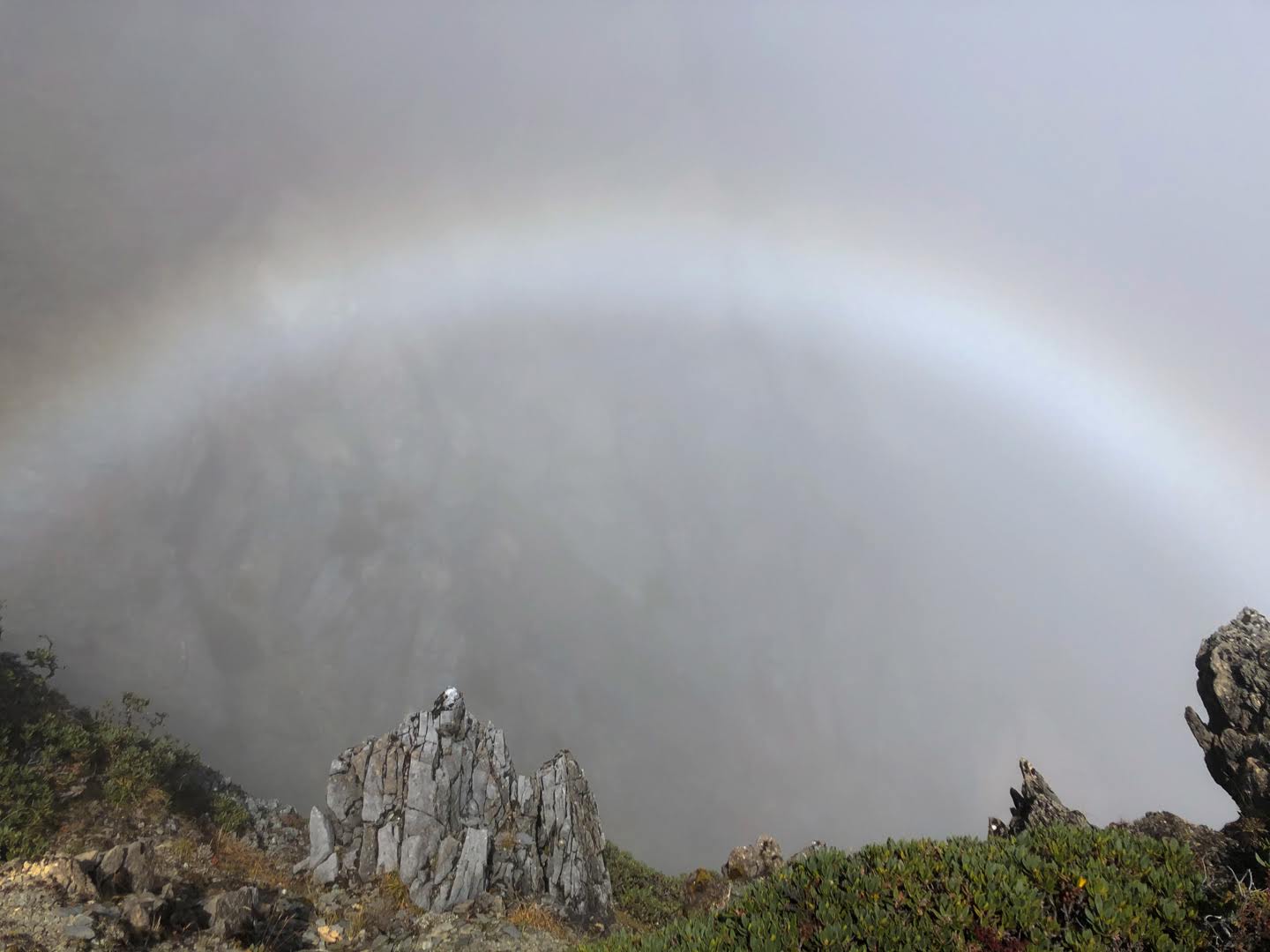 3600m辺りのコルまで登りつめ痩せた尾根の上に立っていると、ブロッケン現象とほのかに虹が立った。ふたりより少し先を行っていた僕は、それらが消える前にふたりと共有したくて「フォー!」とふたりが来る方へ雄叫びを繰り返していた。