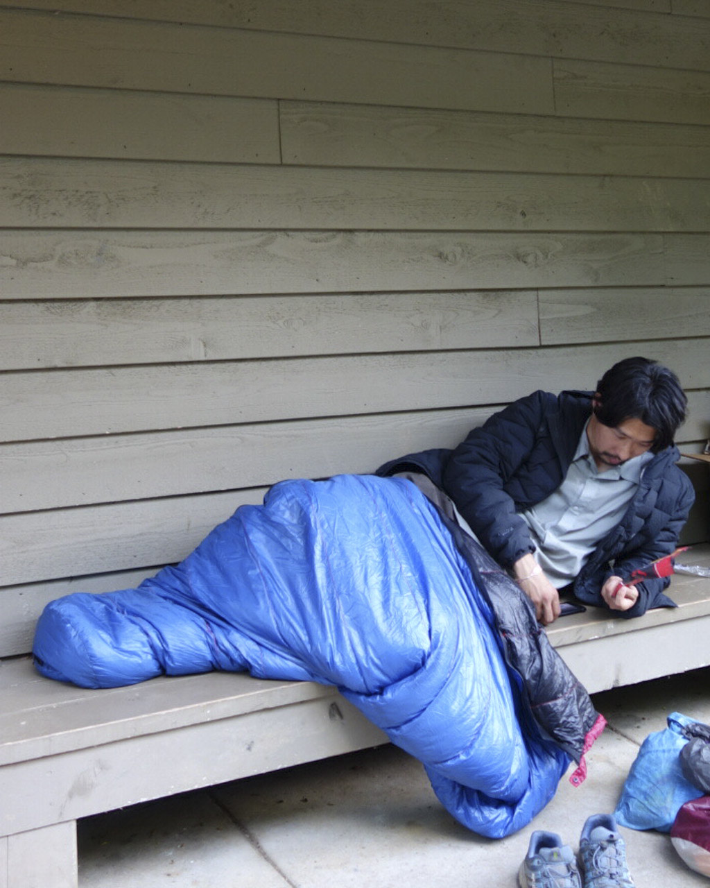 僕はハイランドデザインのダウンバックを手に取る。まだ数回しか使っていないので、生地の肌触りが気持ち良い。この寝袋はフードがついていない。寝相が悪い僕は、就寝時に無意識でフードを触ってしまうため、肩から冷気が入ってくるので、そして朝起きた時、ほぼ毎回フードの中に頭が収まっていない。そこで、頸動脈を締め上げれそうなほど首の隙間をなくすことができるこの寝袋を選んだ。そして、何よりもとても軽い。