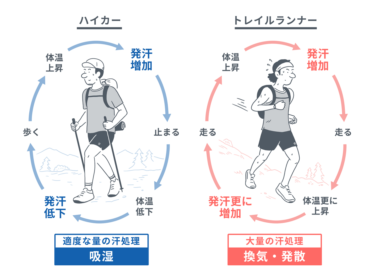 以上の通り、暖かい環境と寒い環境それぞれにおけるリスクと留意点を見てきた。いずれの場合でも、ベースレイヤーの本質的な役割*である「汗の処理」が重要となってくる。ここで、シチュエーションごとにウェアに求められる理想のスペックを定義してみたい。