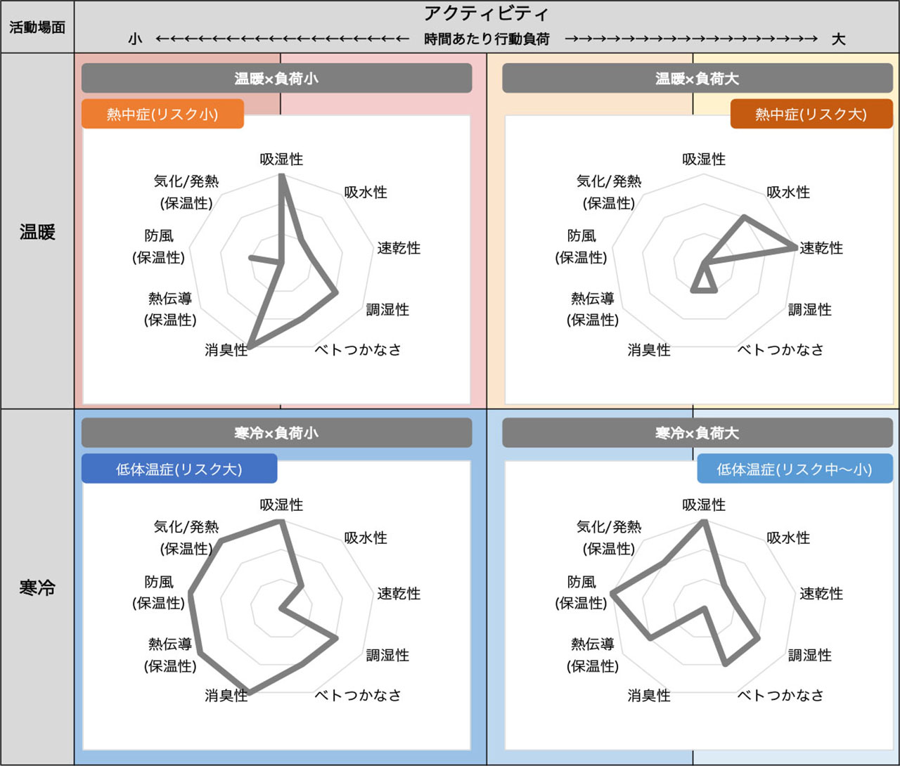 右下「寒冷×負荷大」の場合は「温暖×負荷大」にくらべ保温性の重要度を高め、汗冷え対策として吸湿性や調湿性も重視した。「寒冷×負荷小」の場合は「温暖×負荷小」をベースに保温性全般を最重要とした。