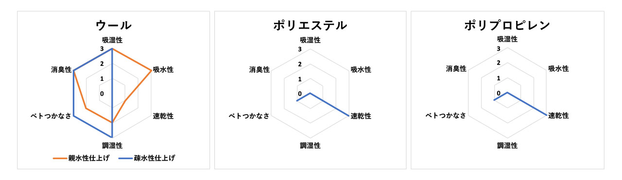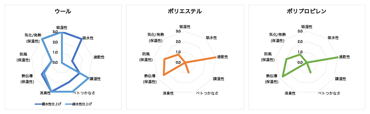 ウールはおおむね「吸湿性」「調湿性」「ベトつかなさ」「消臭性」「気化/発熱(保温性)」で高いスコアとなっており、水を吸い込む親水性仕上げがほどこされている場合には「吸水性」も優れる(一般的なアウトドア用のベースレイヤーは水をはじく疎水性仕上げが多い)。一方でポリエステルとポリプロピレンの化繊は「速乾性」に優れる。こうしてチャートを見るとポリエステルとポリプロピレンの相違はごくわずかであるが、「熱伝導率(保温性)」でポリプロピレンがやや優れる。チャートにはないがポリプロピレンはポリエステルにくらべ疎水性の度合いが高いのも特徴であるが、染色が難しく熱に弱いといった欠点があり、ベースレイヤーの素材としてはポリエステルの方がメジャーな存在となっている。