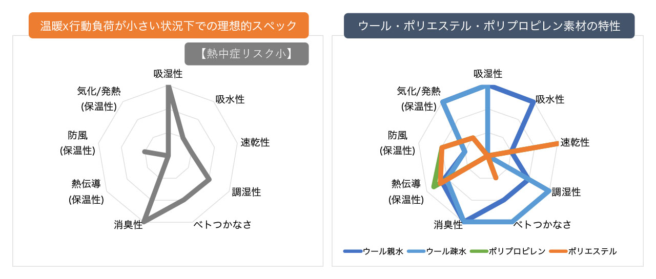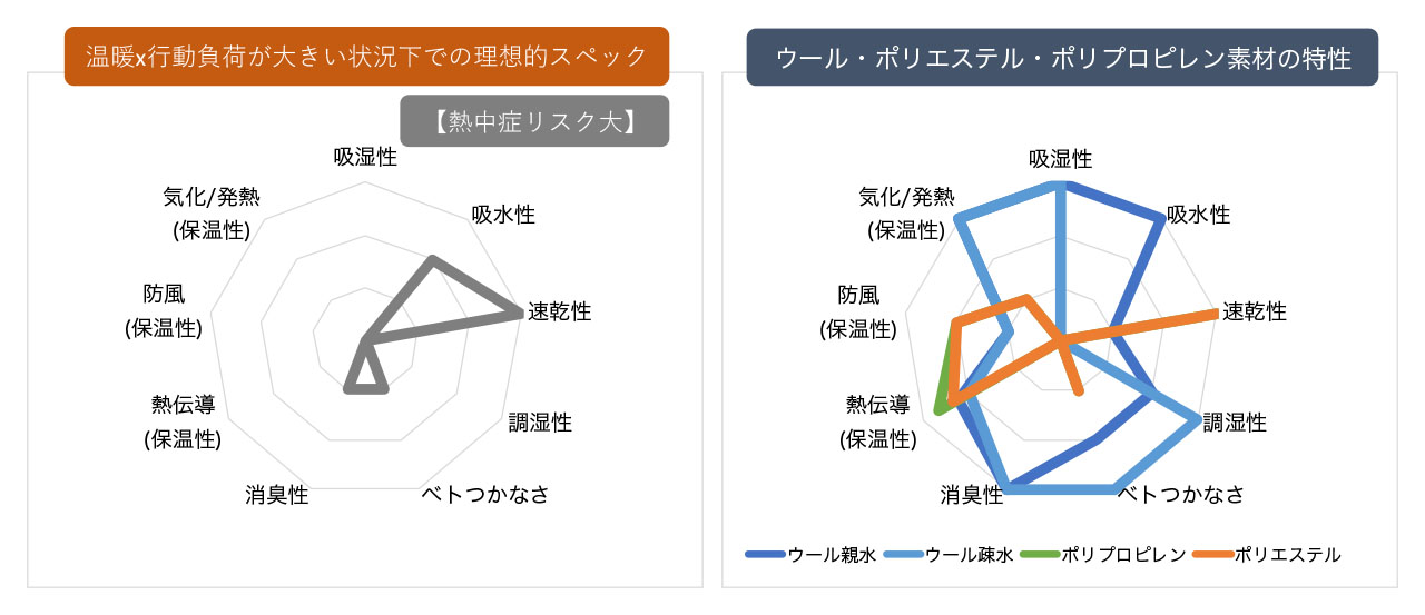 以下に「温暖×行動負荷が大きい場合」の理想スペックと各素材の特性チャートを並べてみた。このシチュエーションに適性の高い素材としては、まずは化繊のポリエステルとポリプロピレンが挙げられる。いずれも高い速乾性を持ち、気化熱によるクールダウン効果が期待できるためである。