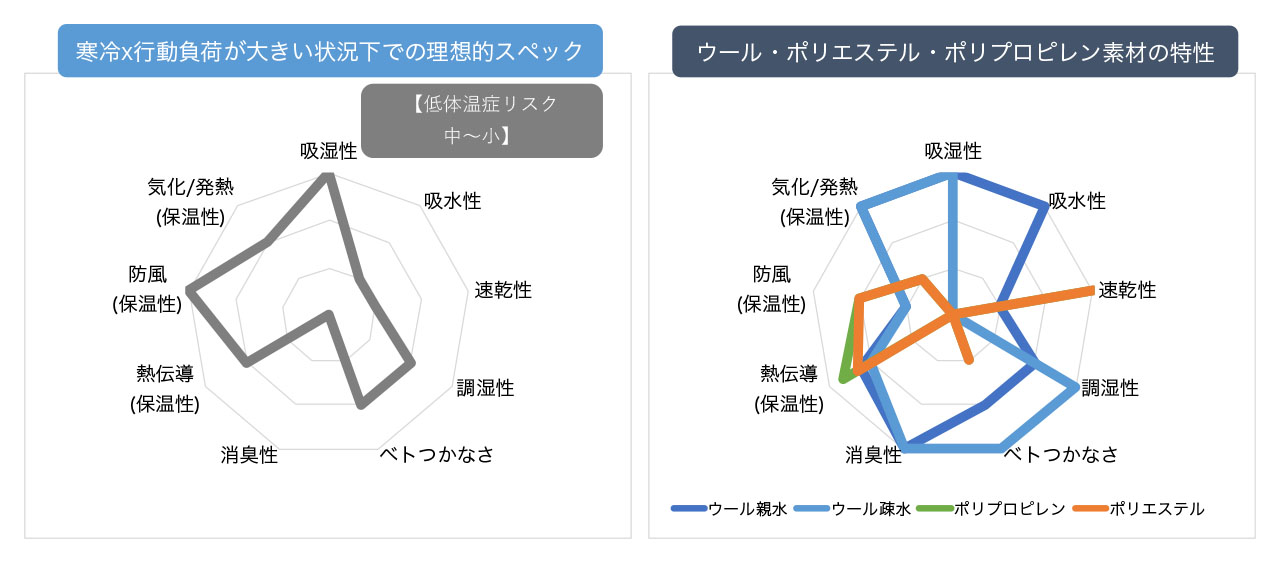 「寒冷×行動負荷が大きい場合」の理想スペックと各素材の特性は以下の通りである。