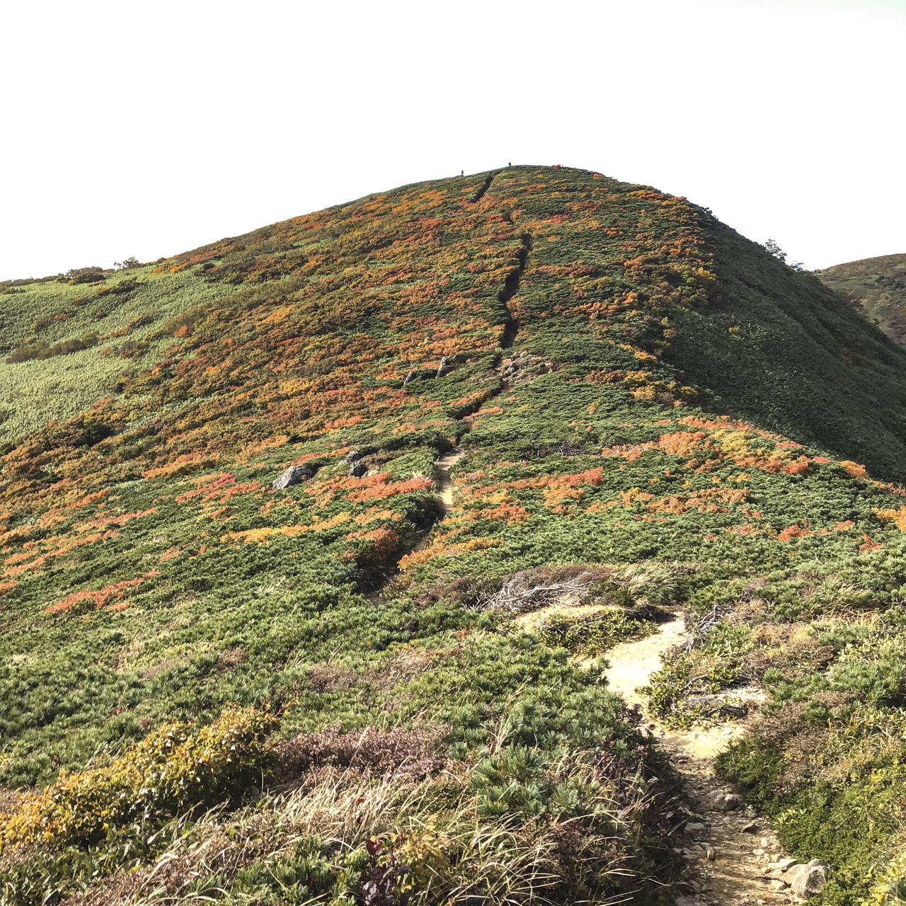 山道祭の会場の網張温泉へ下りるルート分岐を通過し、犬倉山、黒倉山と脚を進めていく。なかなかな勾配の急登もあれば、そのあと平坦なひらけたトレイルに出るなど飴とムチを使い分けていて歩いていて飽きない。