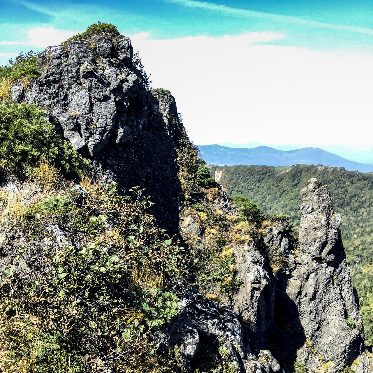 だんだんトレイルは細くなり、危なっかしい岩壁上を進んでいく。鬼ヶ城から岩手山麓の拡がりを目にしたとき驚いた。 数ヶ月前に歩いてきたイースタンハイシエラの山域の雰囲気に似ていたからである。 おおー! こんな風景が日本にもあるのかと、嬉しくって踊りだしたい気分だった。