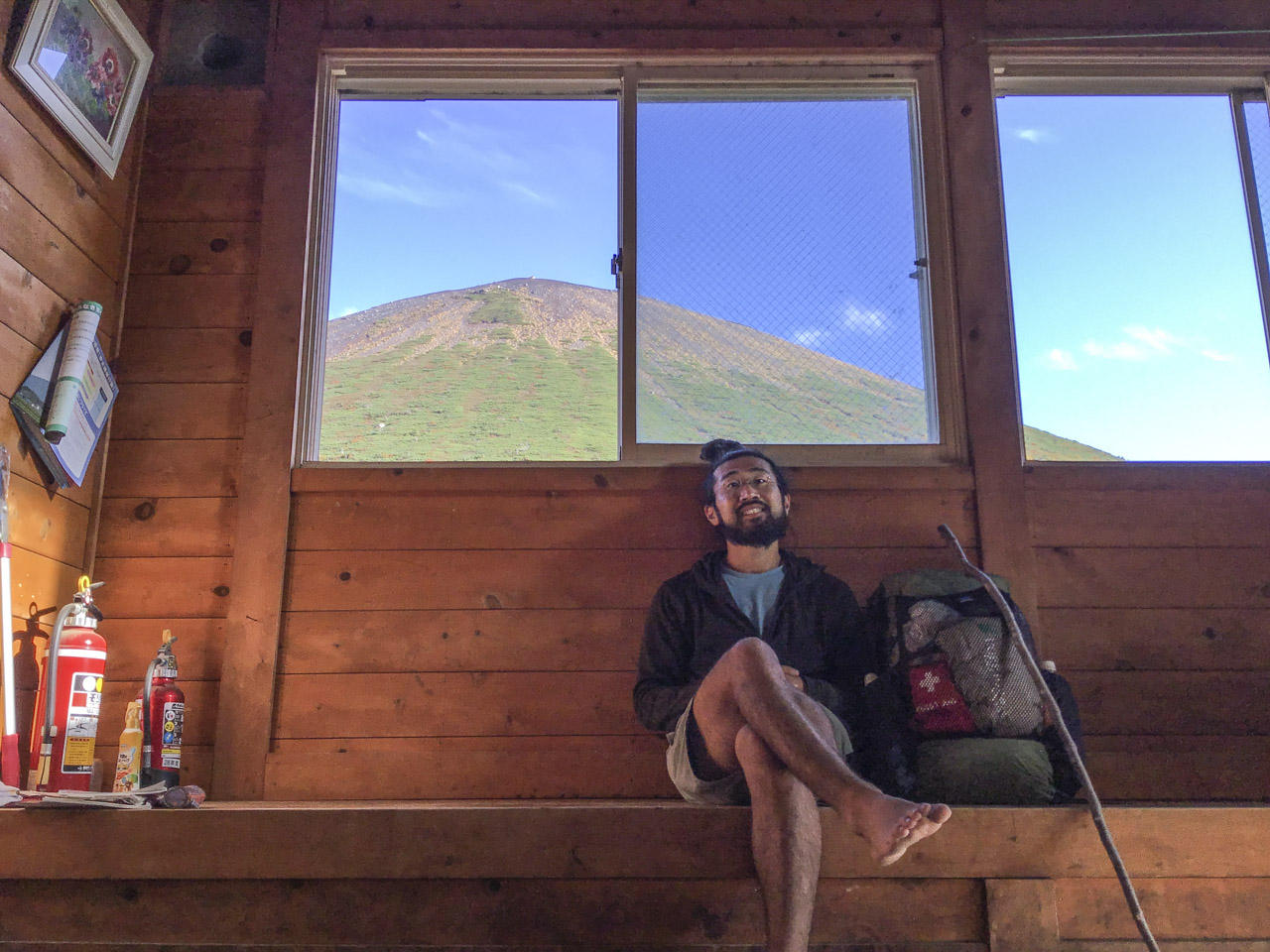 まだ陽も高いうちに秋田駒直下にある阿弥陀が池避難小屋に着けた。ふー、心地よい疲労感で今日も最高だった。ドイツ人の夫婦と関西弁のおいちゃん、男子大学生というメンツで最後の一夜をともにする。