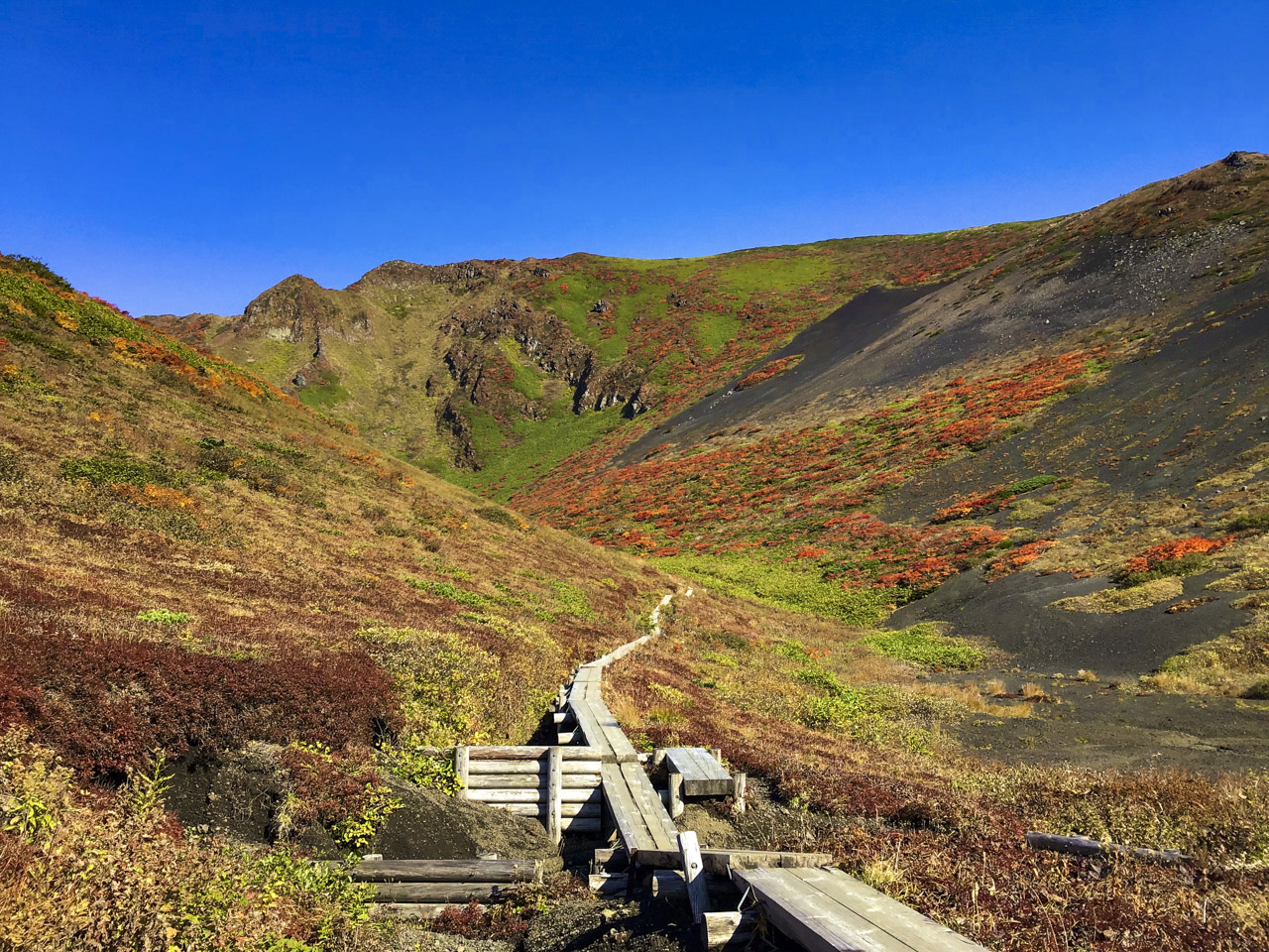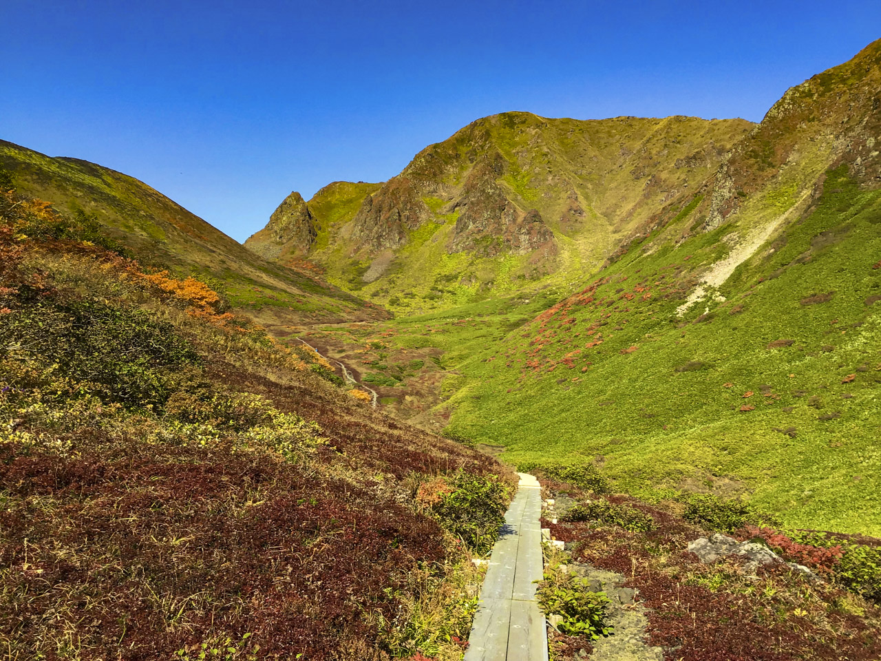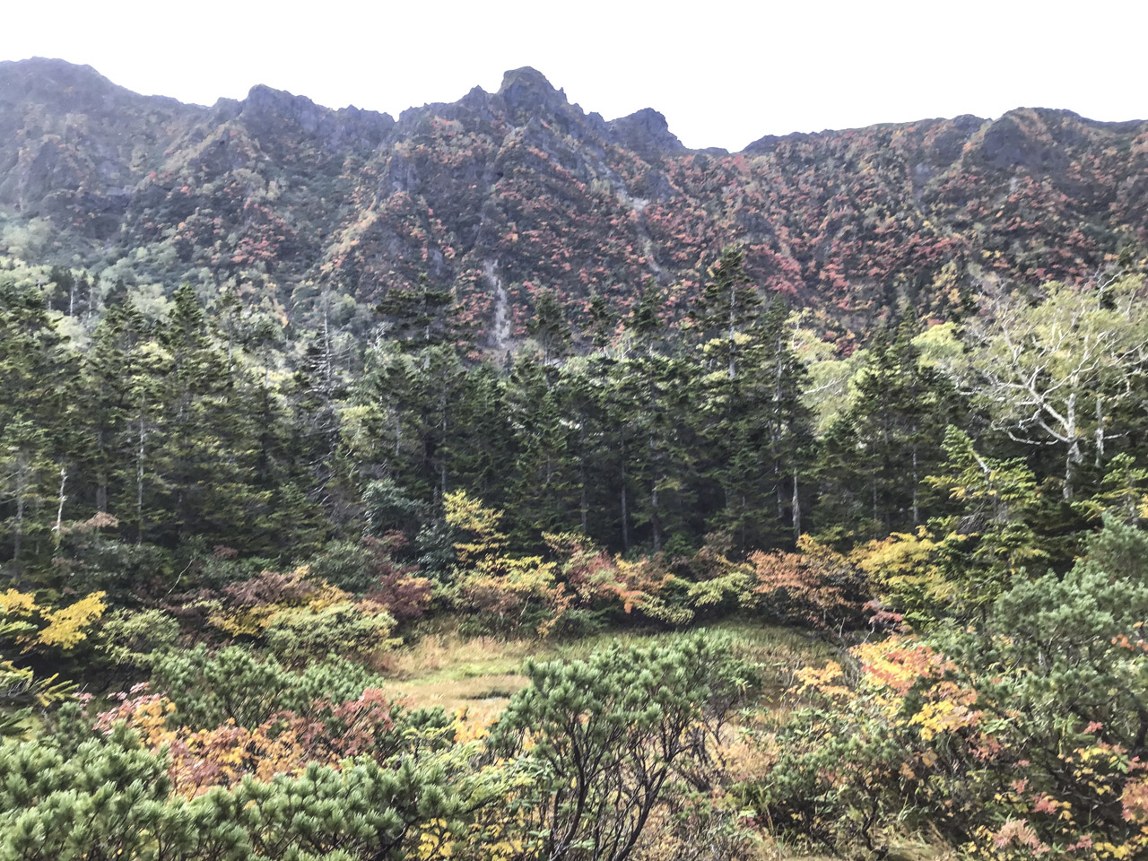 僕はガッツポーズで最高な感情を表現した! 艶やかなハイマツの緑に目を見張るような黄色やオレンジ、赤の紅葉のコントラストが美しく、自然が創り出した景色に、自然の一部である人間がそれを見て感動し、この風景が完成している気がした。 地球は自らのこの完全で素晴らしい生と死の織りなす美しさを味わいたいがために僕たち人間を創り、人間の五感を通して自らの完璧な美しさを堪能しているのかもしれない。 けれど、そんな言葉もこの完璧なまでの美しさを前にしては、どこか虚空へと消えてしまう。