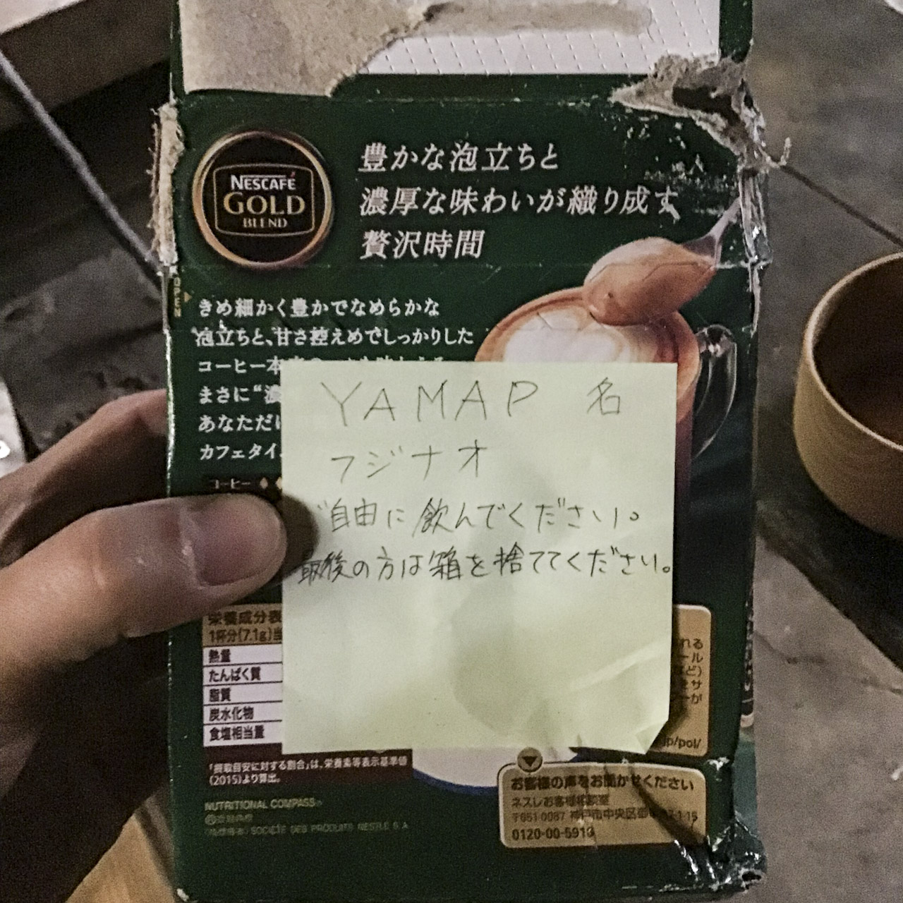 今日はもう、乾いた衣服に着替えてゆっくり休むことにする。山荘には、数日前にここに来たハイカーがトレイルエンジェルよろしくカプチーノを置いていってくれていた。八瀬森避難小屋には、 ありがたいことに毛布やふとんが常備されていたので、毛布にくるまり 冷えた身体に、熱いカプチーノが優しい。「フジナオ」さんありがとう。
