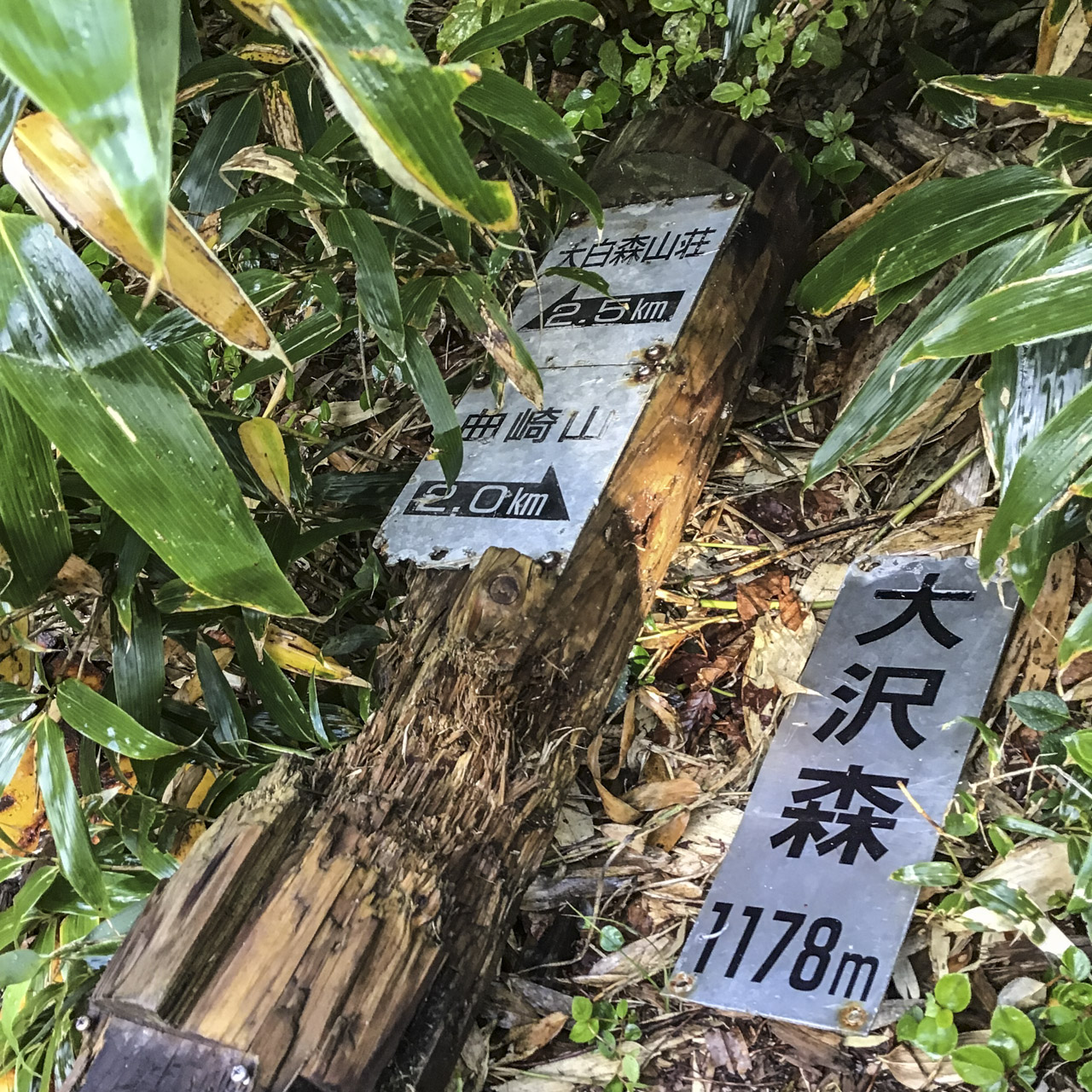 昨日と同じような背丈ほどのヤブを漕いで歩いていく。雲が多めだが、ときおり太陽が顔を覗かせるので気持ちがいい。と、調子良く歩いていると道標の看板がえぐられているではないか! そのあとの道標は無残にもへし折られて投げ捨てられていた!