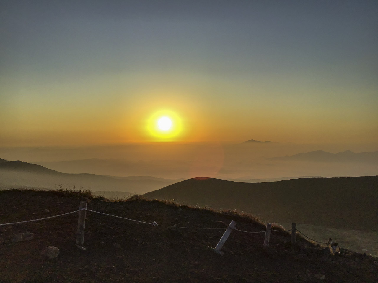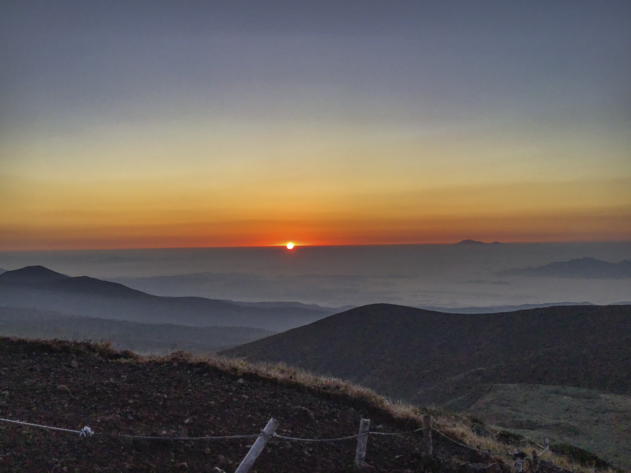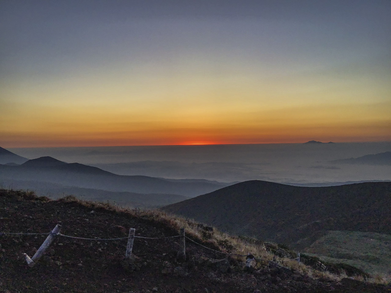秋田駒の頂まではあっという間で、頂に着くと視界の限り雲海が拡がっていた。だんだんと空の一点が緋く染まり、見る間にグラデーションになり空全体に拡がっていく。
