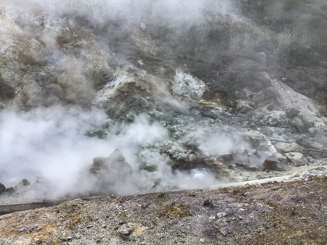 そのため、硫黄の匂いと湯気が上がるそこかしこに、地熱で身体を温めているのだろう、日傘をビーチパラソルさながらに地面におっ立てて寝転がる人、人、人である。