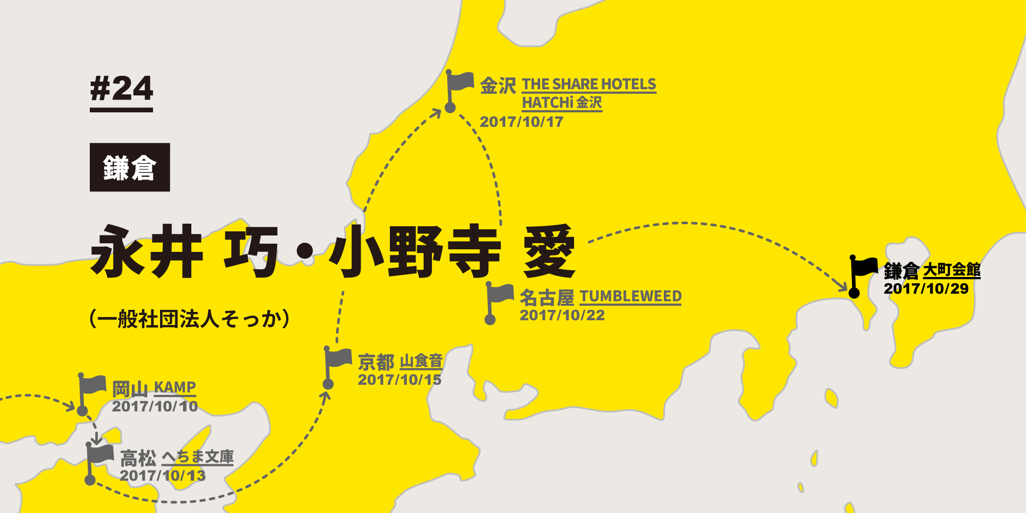 昨日は鎌倉の大町会館で日本を縦断して行ってきたこの『HIKE LIFE COMMUNITY TOUR 2017』の最後のイベントだった。前回(#23)の土屋智哉さんに続く最後のゲストスピーカーを担当してもらったのは、鎌倉の隣町、逗子を拠点に活動を行う『一般社団法人そっか』の永井巧さんと小野寺愛さんのおふたりで、翌朝、僕はふたりにもうすこし話を聞かせてもらう約束をしていた。