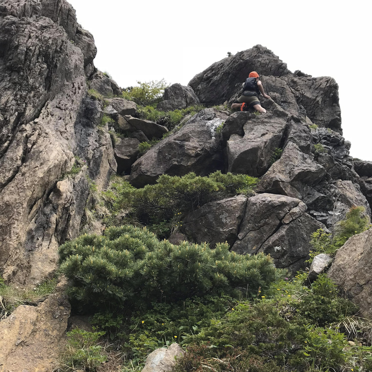 上野 一歩一歩、一手一手が不安定ですね。落石の危険性があるので人の後ろにはいかないようにします。ルートは色々と取れるので、縦の列にならないで、それぞれに自分の行けそうなルートを同時に進む感じです。ザレ場を四つん這いになって進んだり、ボルダーセクションがあったり、「ここ、おもしろそうだな」って思うルートと自分の技量とを比べながらトライしていく。