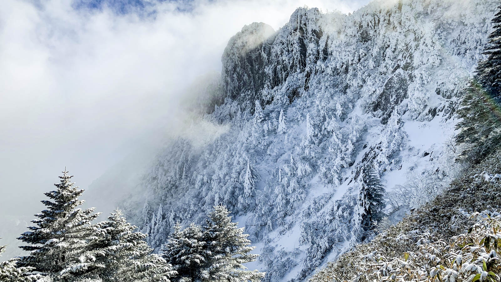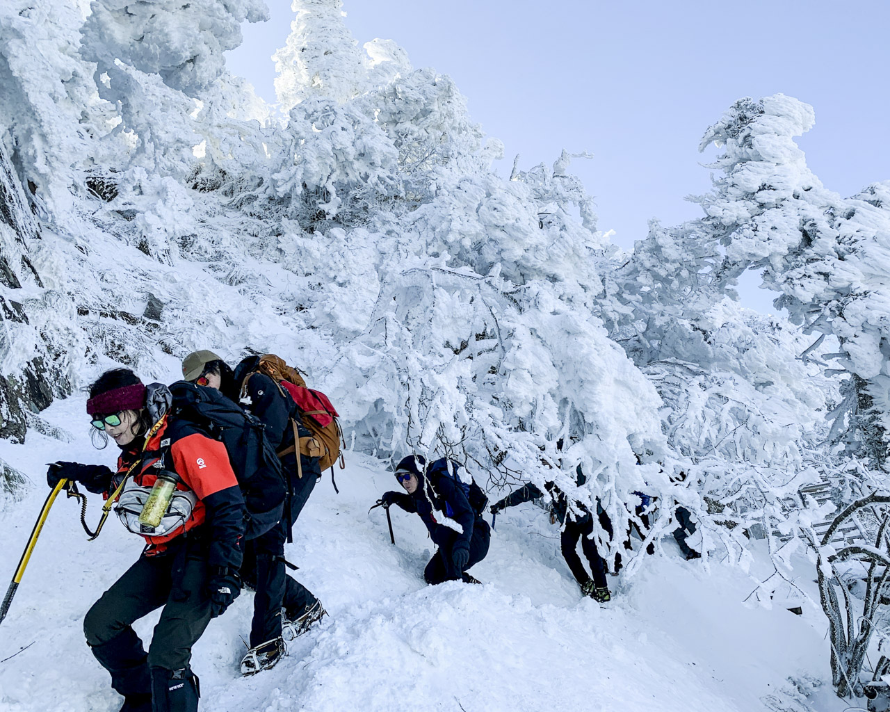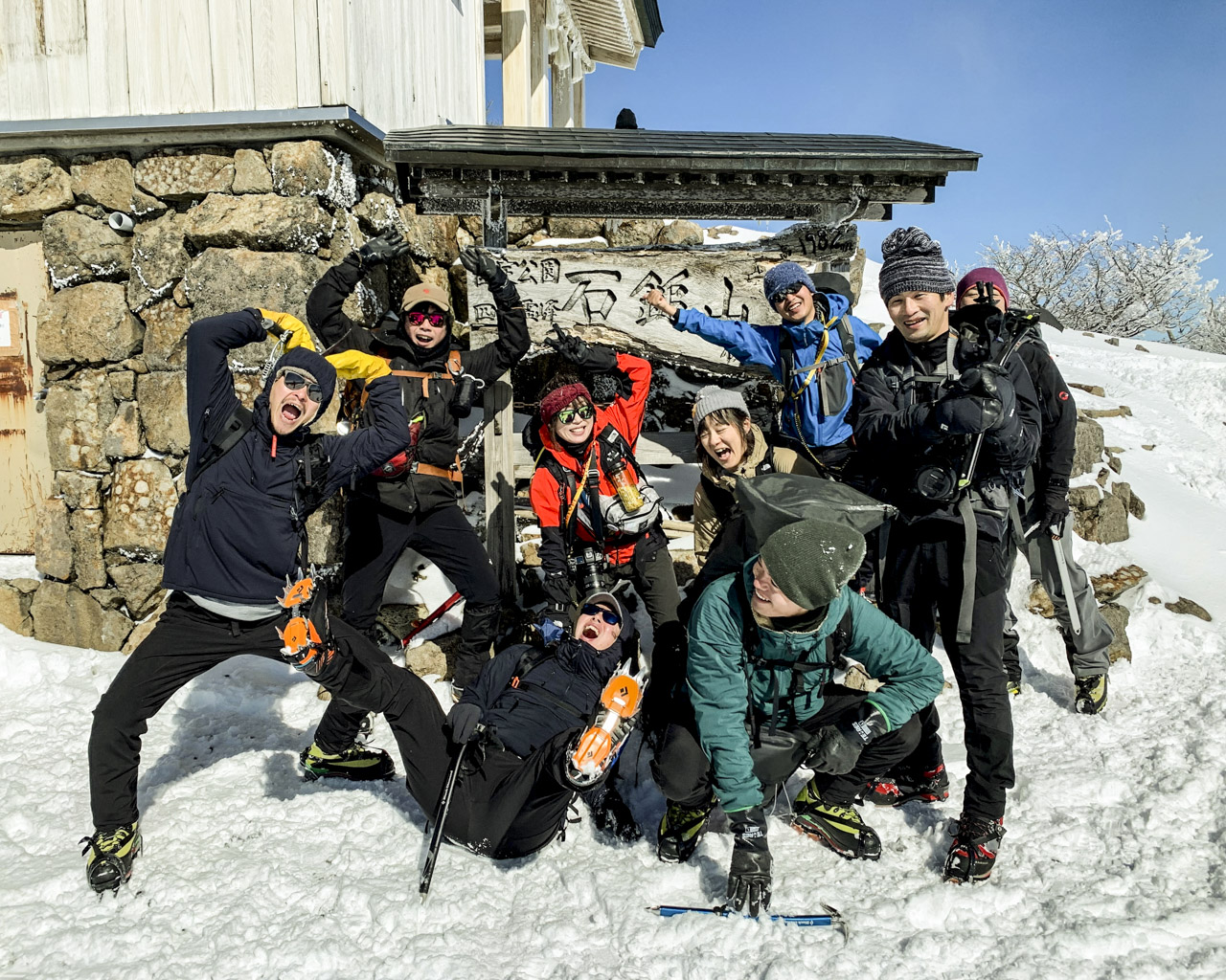 菅野 石鎚山も今期一番の寒波で真っ白になってすごくキレイでした。今回はスキルアップということで、アイゼンやピッケルの使い方やその意味などを説明し、冬の山を歩くテクニックを体得してもらいながらのハイキングでした。登山道じゃないところもラッセルして歩きましたね。