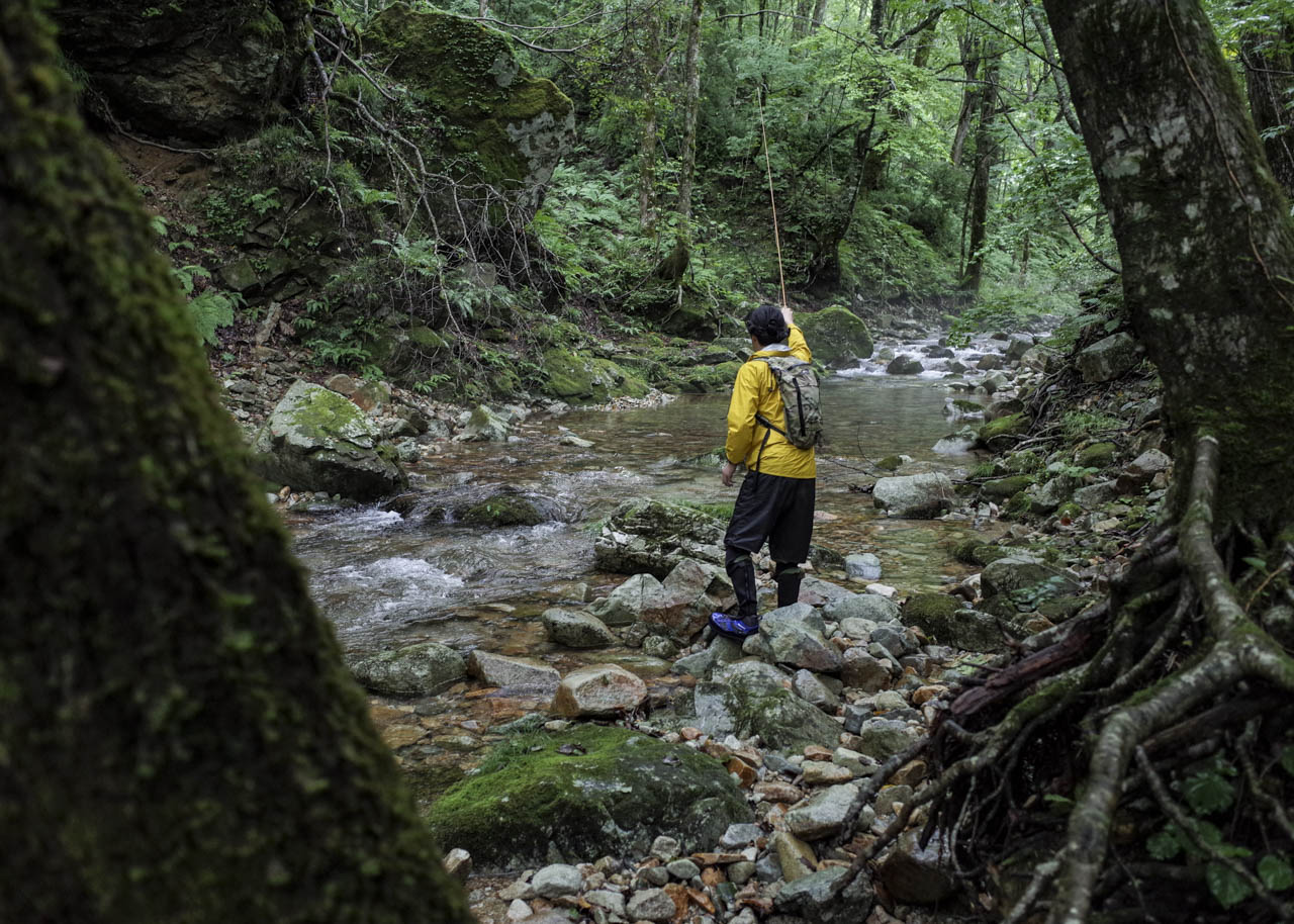 廻谷 源流釣行は8月末にやった1泊2日のプログラムです。参加者3名に僕と水戸さん、山と道スタッフの中川爵宏さんの6名でしたね。大雨の影響でそもそも行こうとしていた沢には行けなくて、急遽場所を変えたんですが、そのおかげで、自転車を使ってアプローチするという新しい展開がありました。