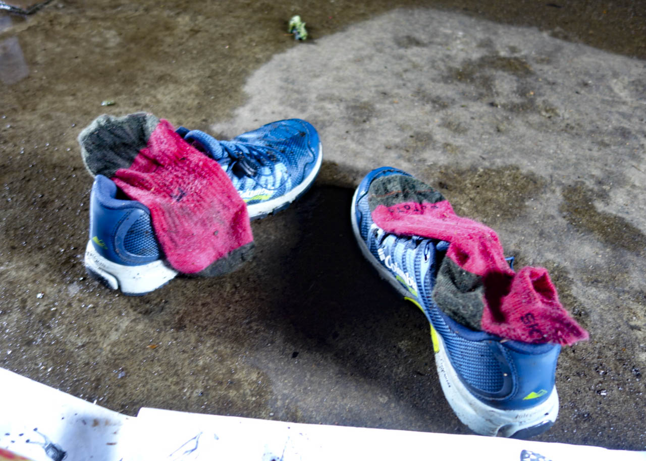床に落ちる小石を蹴りながら内部へ進み、水分を含み重くなったバックパックを下ろす。鈍く気持ち悪い音がした。テントのグランドシート用のタイベックを敷いてその上に座り、泥だらけのシューズ、そして肌に張り付いた靴下を力一杯引っ張って剥ぎ取る。