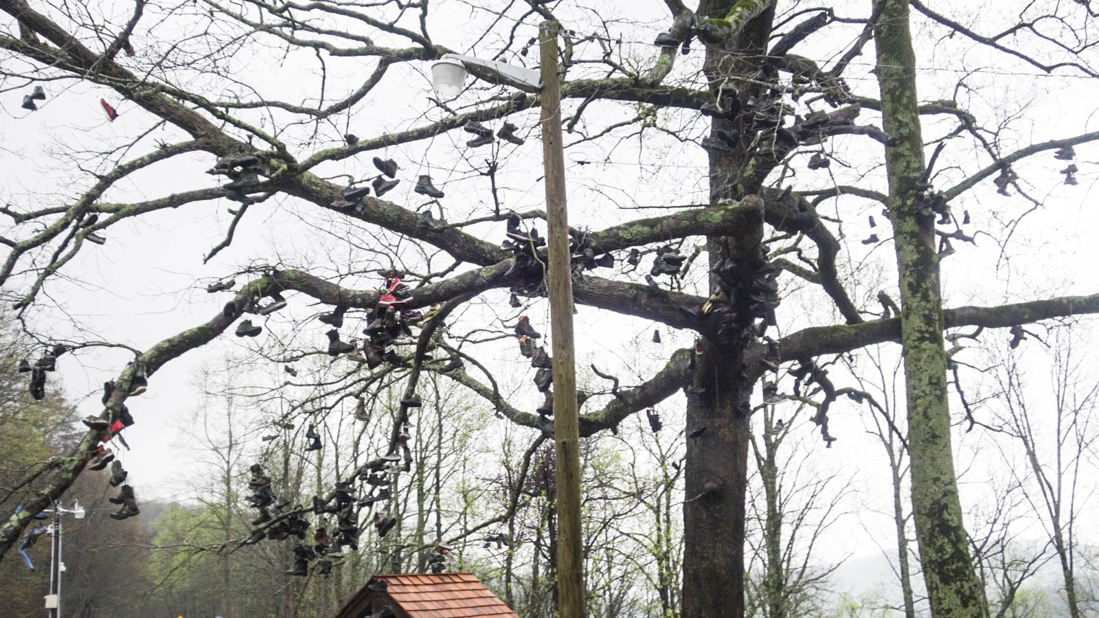 ブラッド・マウンテン山頂からニールズ・ギャップまでの4マイルの下り坂は状態が良く、傘も十分に雨を防ぎ快適なハイキングだった。想定より早く到着したニールズ・ギャップは深い霧に覆われいて、視界が悪い駐車場をゆっくりと進むと、突如、霧の中からうねうねとした枝を四方に伸ばした大木が現れた。霧から生み出されたバケモノのように不気味なその姿をよく見ると、枝からはおびただしい数のシューズがぶら下がっている。これは一体何を意味するのだろうか? ただ趣味の悪いオブジェにしか見えない。