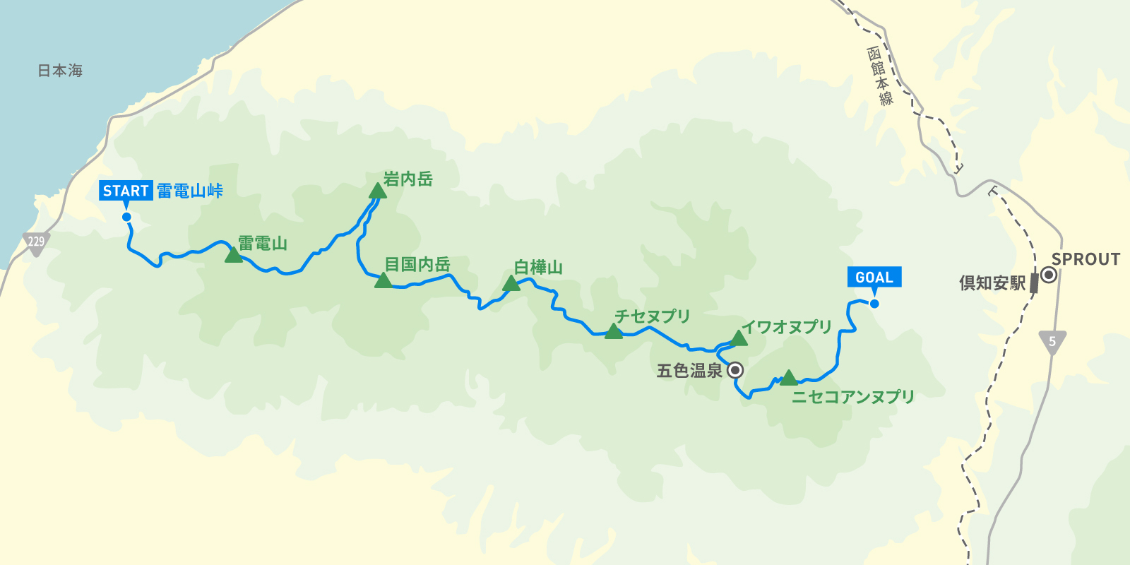 「ニセコ・オートルート」は日本海から倶知安(くっちゃん)駅前にある僕のコーヒー屋『SPROUT』までを1本の線でつなぐ縦走路。雷電山、幌尻岳、岩内岳、目国内岳、前目国岳、白樺山、シャクナゲ岳、チセヌプリ、ニトヌプリ、イワオヌプリ、ニセコアンヌプリ、ワイスホルン、旭ヶ丘と12の山とひとつの丘を結び、全長は約50kmとなる。