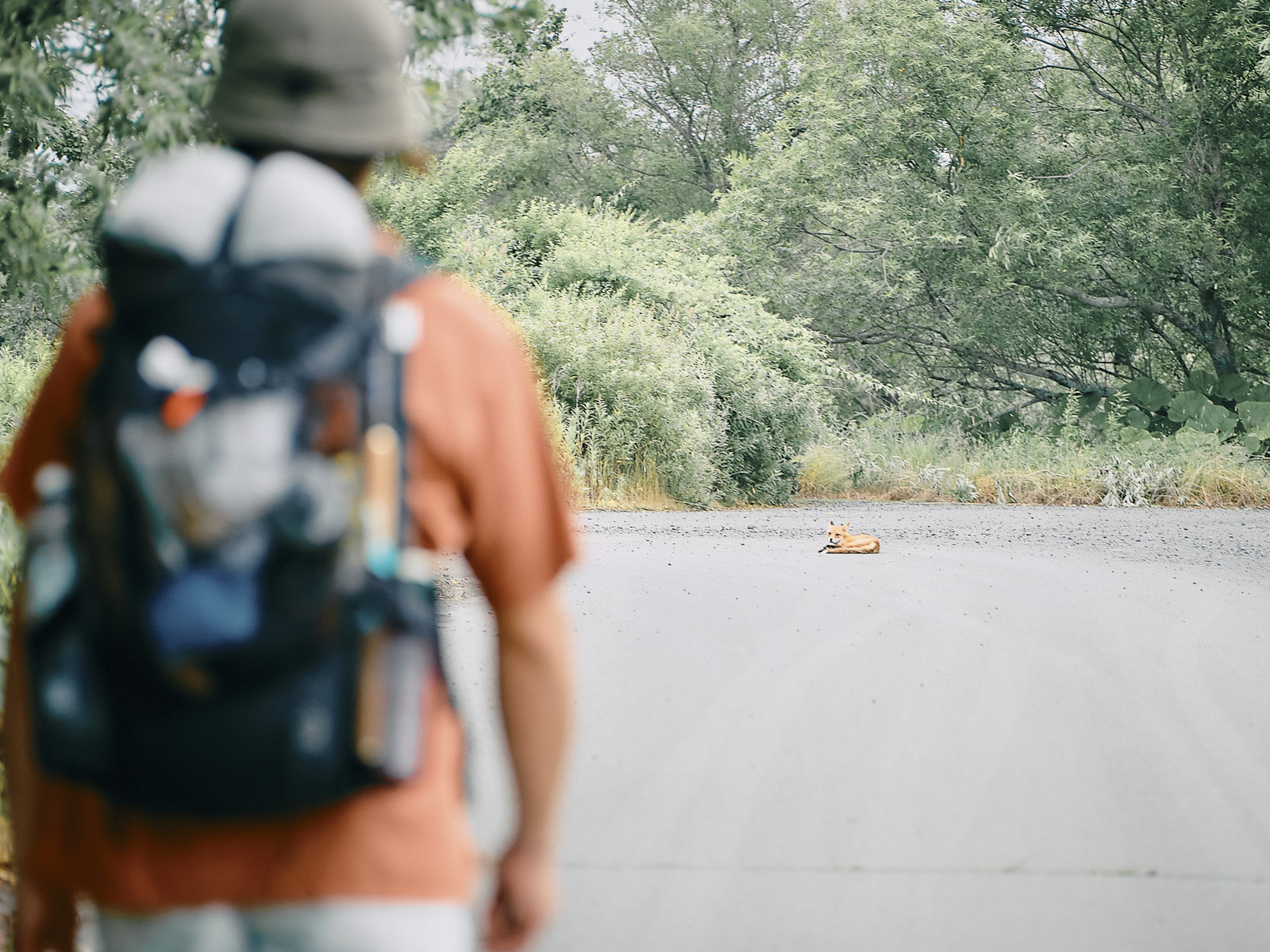 キツネはしばらくすると、慌てた様子も見せず舗装路をトコトコと歩いていった。どうやら、本当に寝ていただけのようだった。本州ではなかなか遭遇することのない光景に、北海道という場所の特殊さ、そして旅の始まりを感じた。