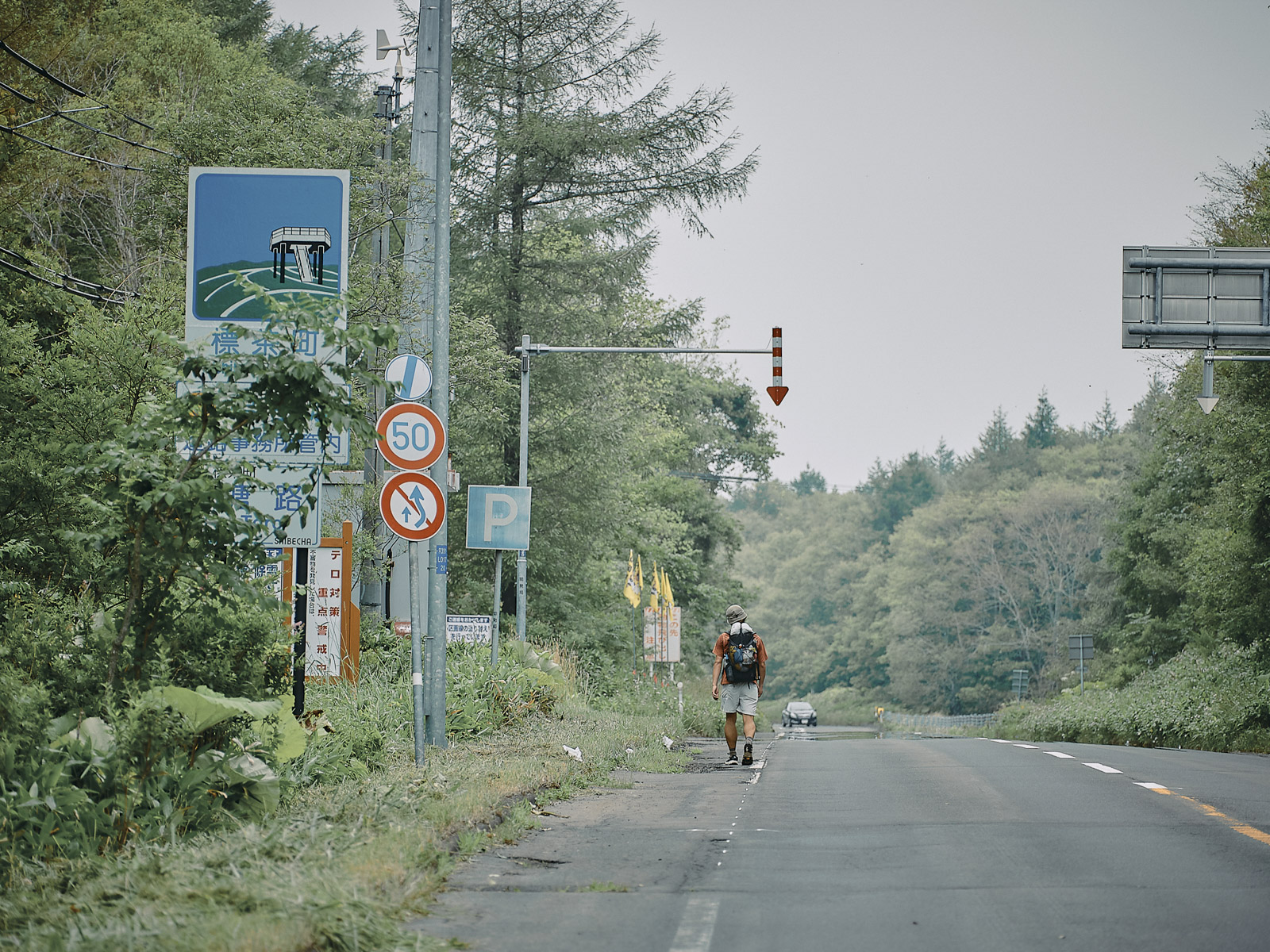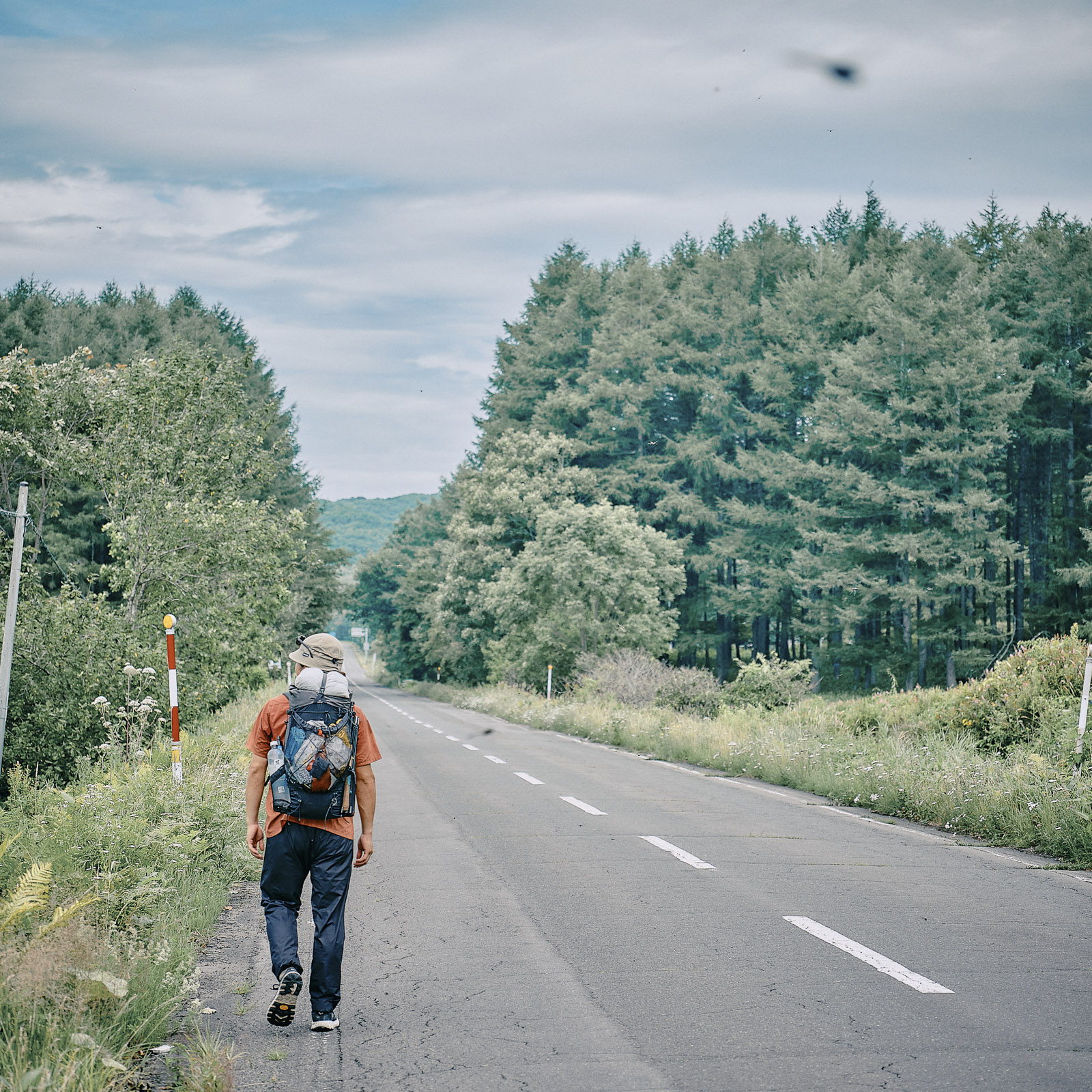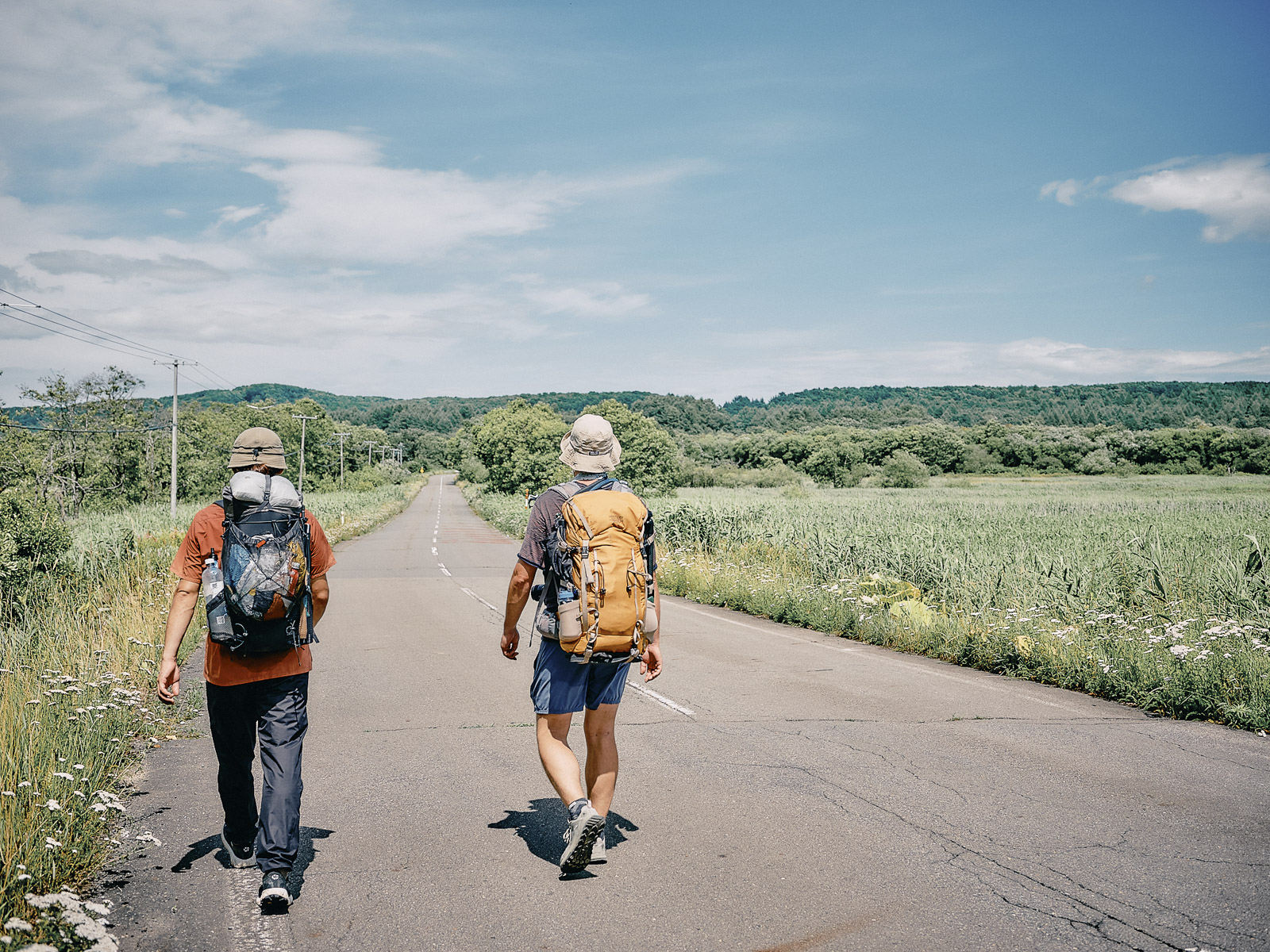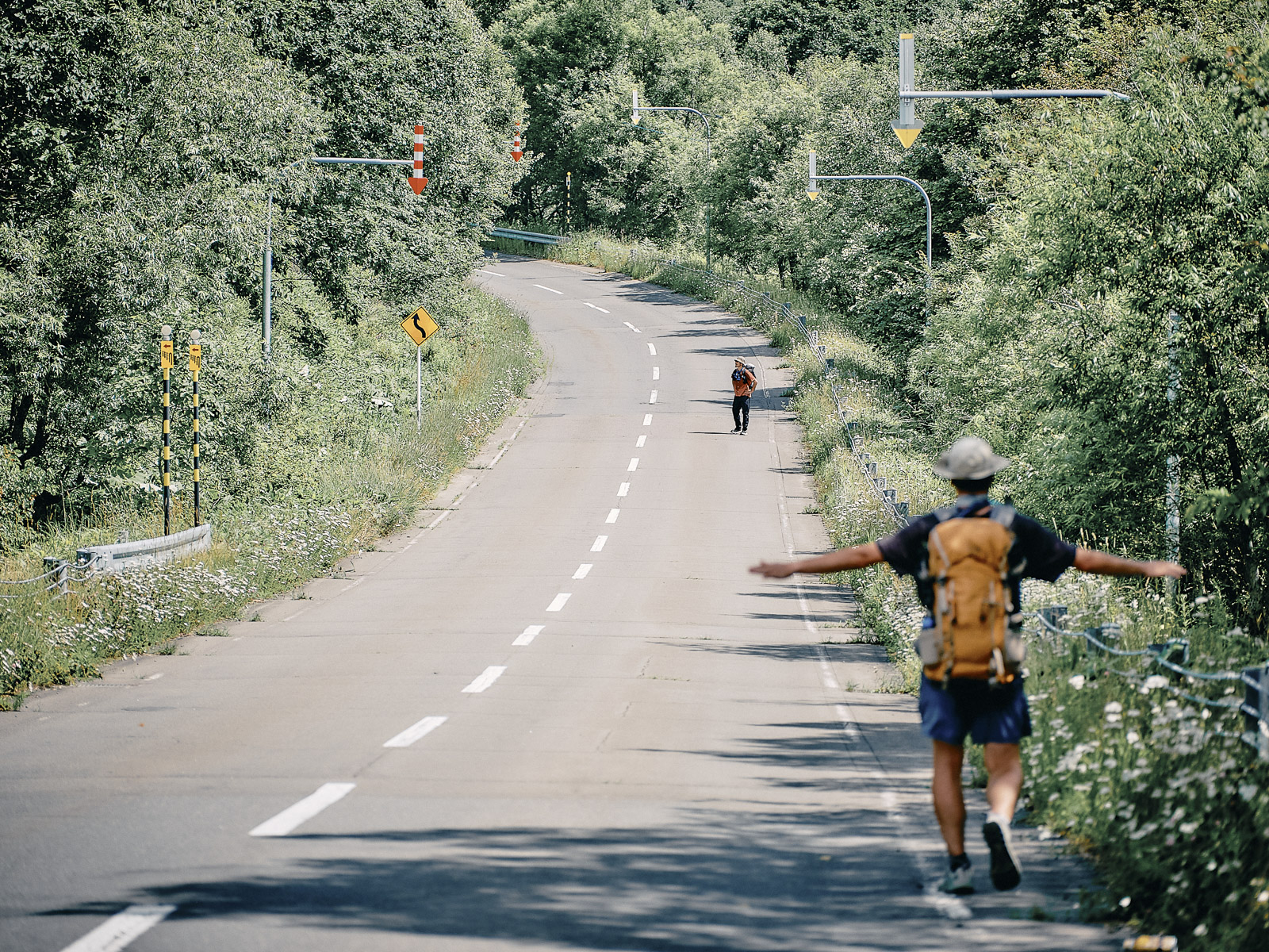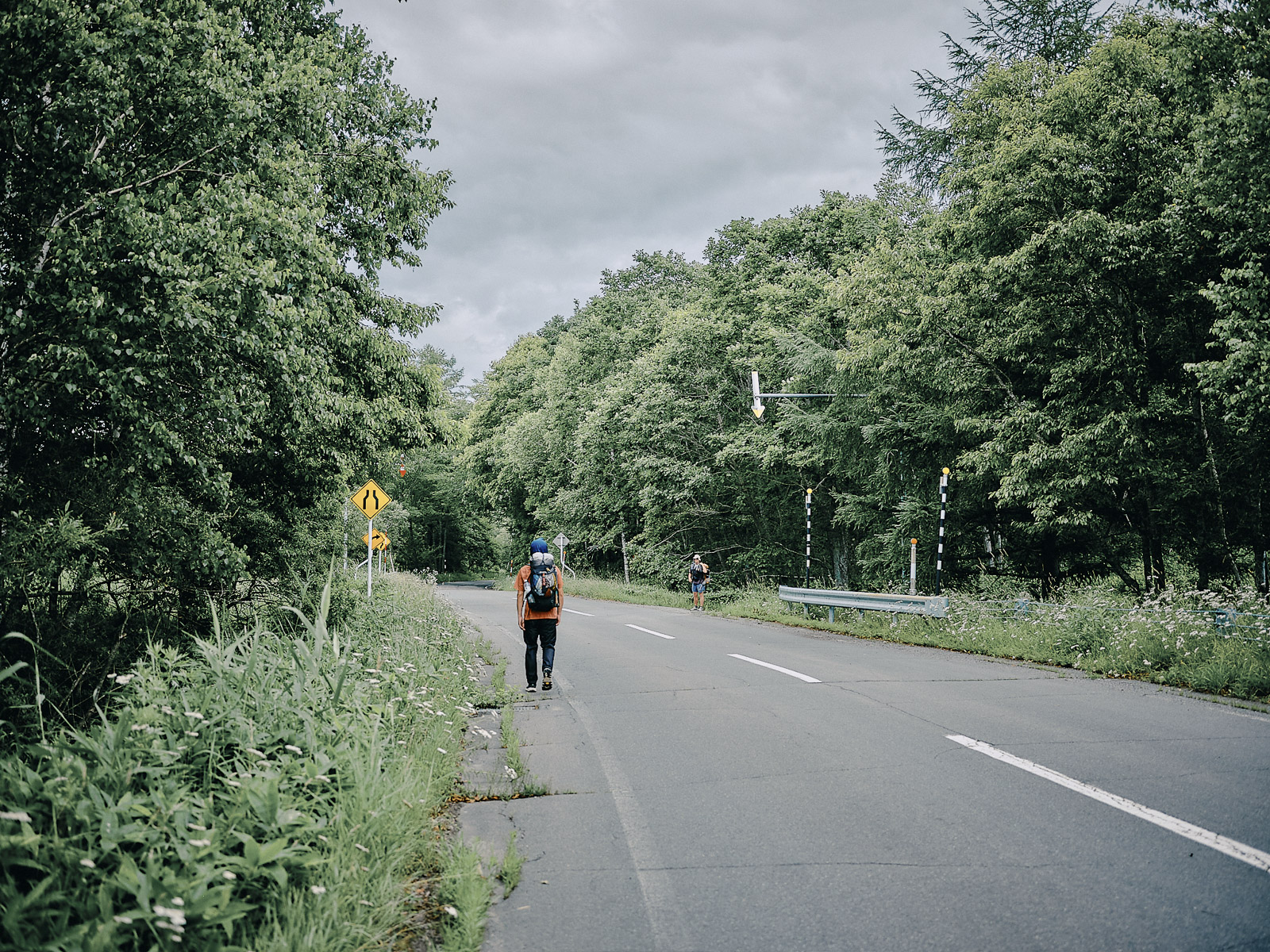 そんな会話をし、ジョウイチさんと僕たちの距離はごく自然な流れで離れていった。とはいえ、ここは北海道。直線の道路が多いこともあって、振り返れば遠くでカメラのレンズを覗き込み、シャッターを切る彼の姿が見える。道路脇に咲く花や、花に集まる虫を撮っているのだろうか。他のハイカーに依存しない楽しみ方をする彼を見て、ハイカーってやっぱりいいなと思った。
