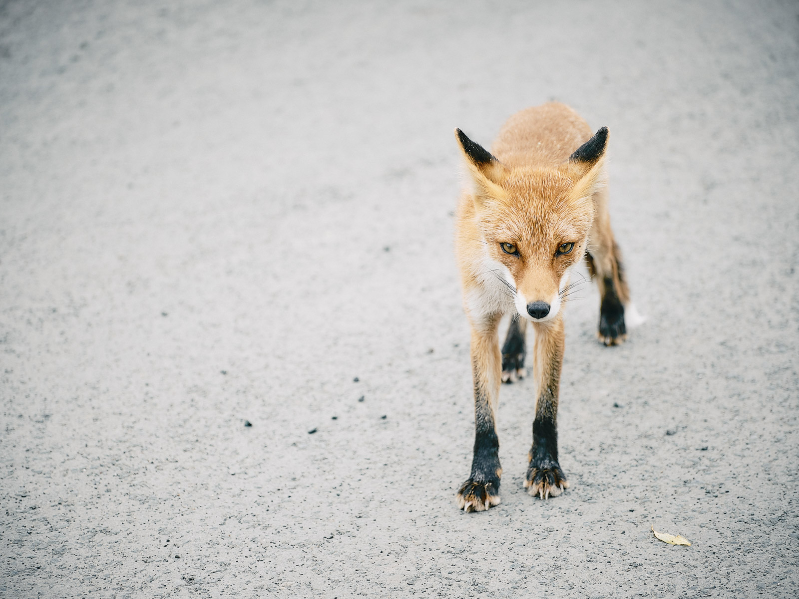 かなりの距離まで近づいても、キツネは顔をこちらに向けるぐらいで立ち上がろうとしない。怪我をしたのだろう。「かわいそうに」と思い、腰を下ろし観察する。すると、むくっと立ち上がった。