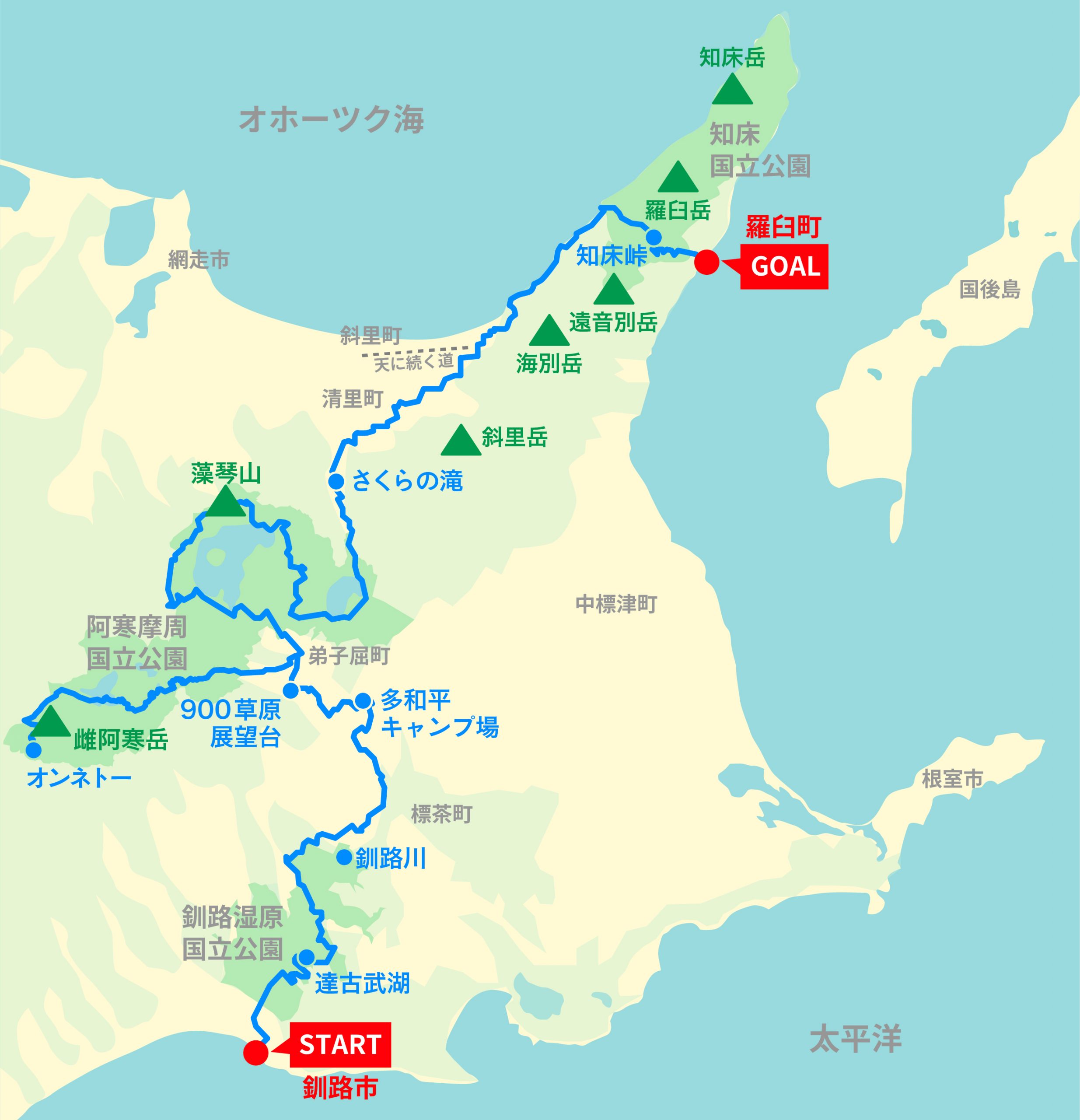 釧路市から羅臼町までを南北に縦断するルートとなっており、自然と地域の魅力を深く体感できる歩く旅の道となることを目指して、北海道の地に産声をあげた。