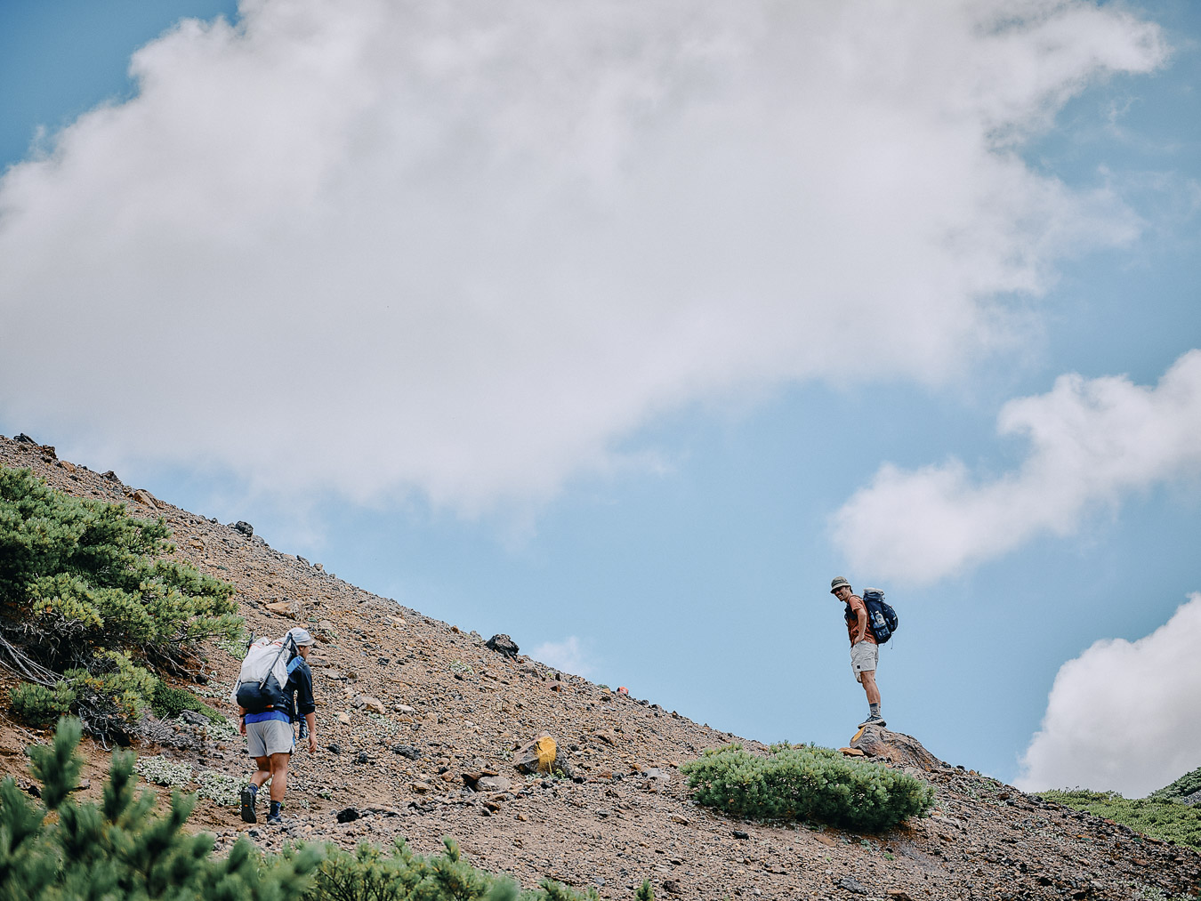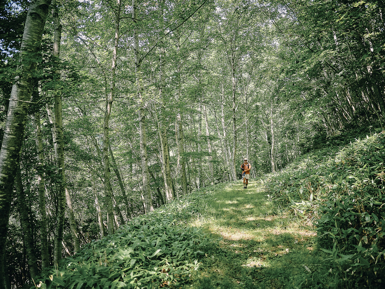 北海道東トレイルが始まって以来、初めて登山道を歩いた。田安くんは「僕やっぱり登山道が好きです!」と軽快に歩く一方、タニーは無言でペースダウン。正反対のふたりを引き連れ標高をグングンと上げていく。