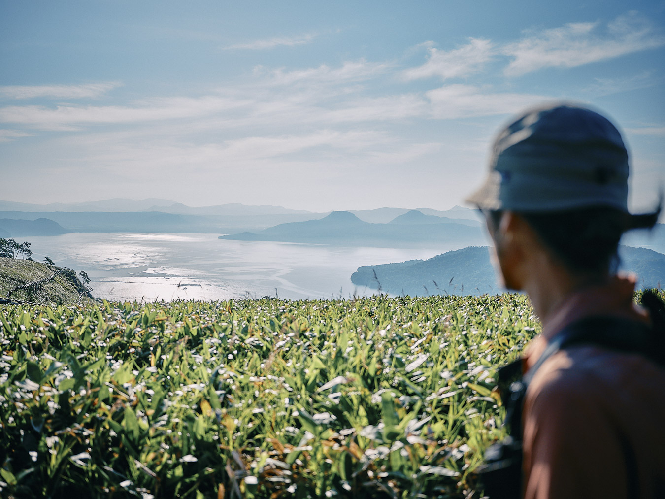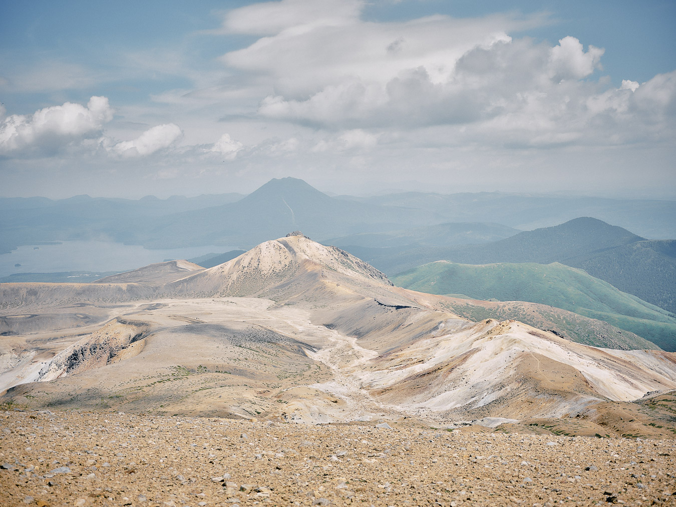 山頂付近からは阿寒湖を望むことができ、その対岸には雄阿寒岳、さらにその向こうに見えるのは、屈斜路湖の外輪と思われる稜線が続き、そのさらに奥にうっすら見えるのは斜里岳だろうか。そして、平らな土地が広がる南側には釧路湿原が広がっているのだろう。僕たちが旅している道東を俯瞰して眺めているようだ。