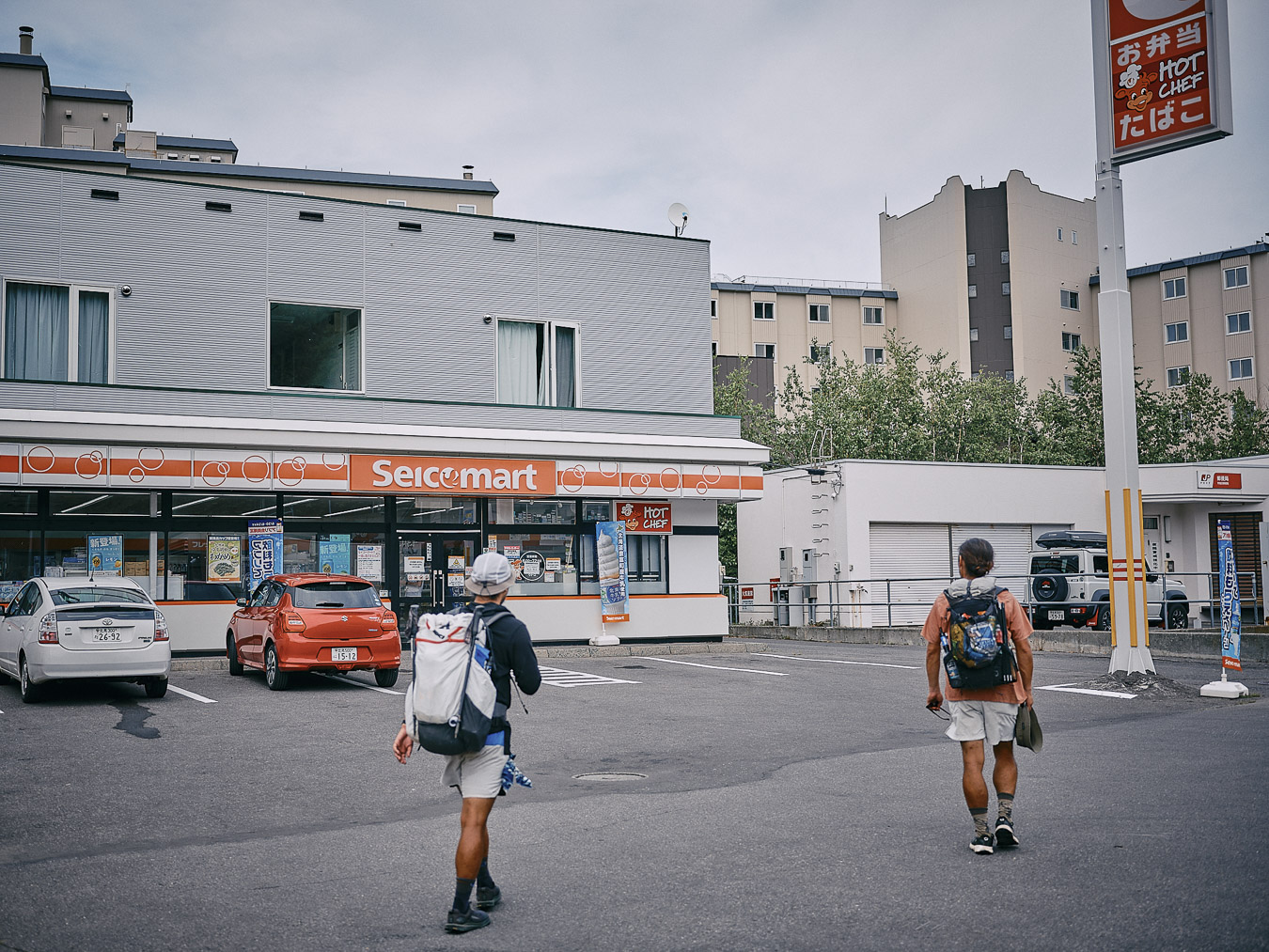 8時頃にテントを撤収し、近くのセイコーマートに腹ごしらえをしに行く。セイコーマートのホットシェフ(店内調理でおいしいと評判)のおにぎりと唐揚げを購入し、店先の影でそれらを頬張る。