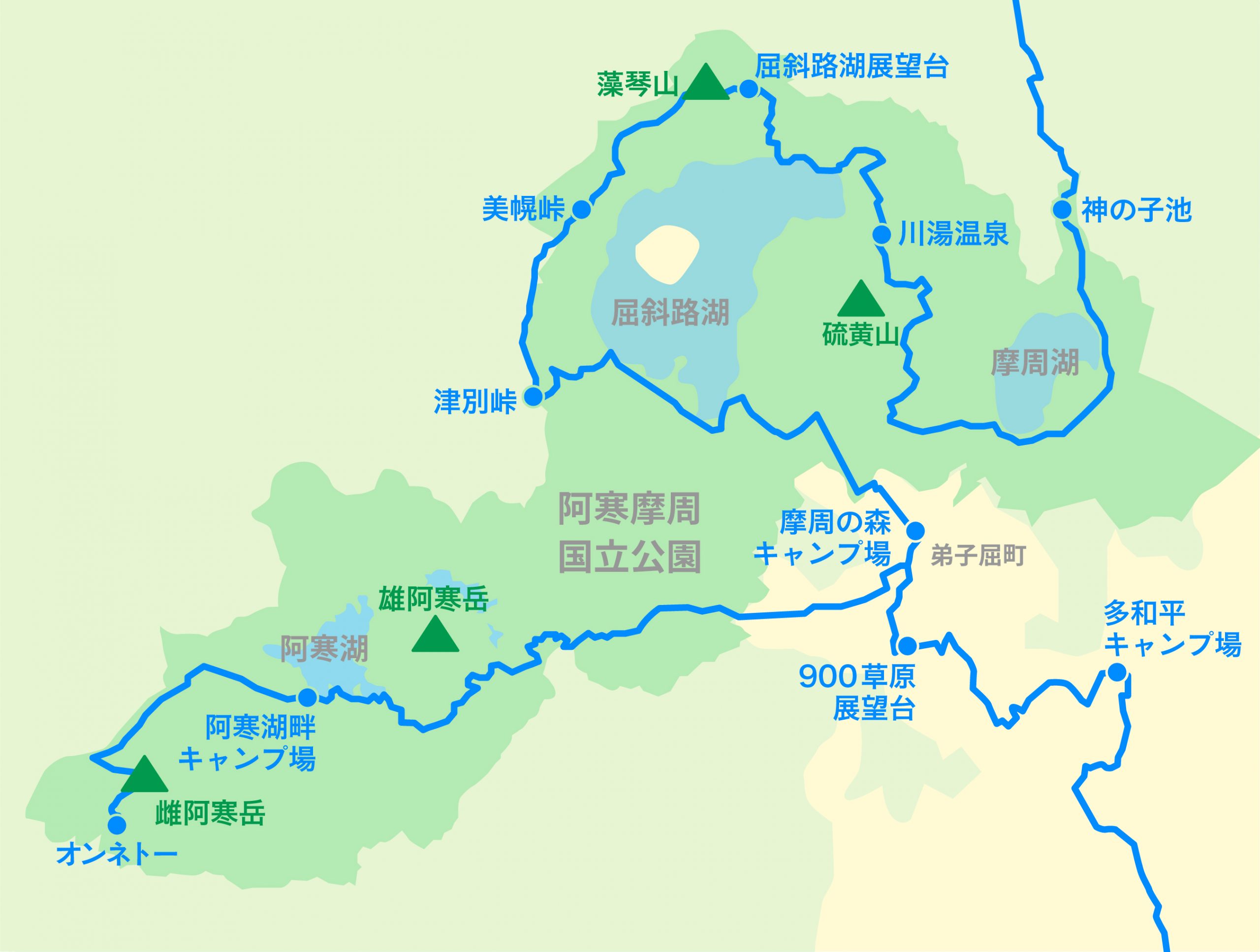 そして、津別峠から藻琴山までの25kmの区間にカルデラの縁をなぞる屈斜路カルデラトレイルが通っている。美幌峠はその中間地点に位置する。