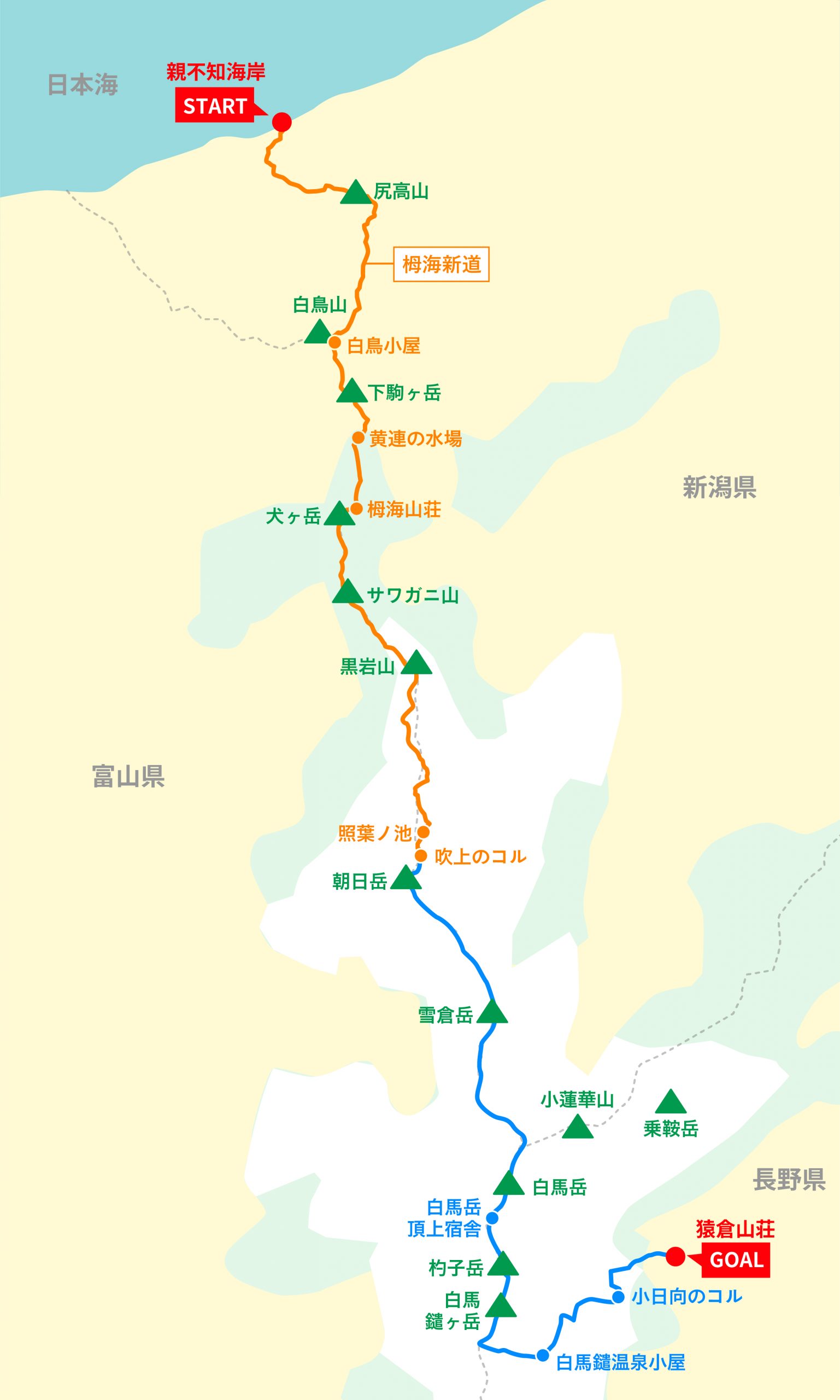 海抜0mの親不知海岸から2,932mの白馬岳へ、50km弱を2泊3日で歩く。先人の開拓者のロマンを感じられるルートですが、軽量化を進めて挑んだ今回でも、歩き切るには長く厳しい道のりでした。