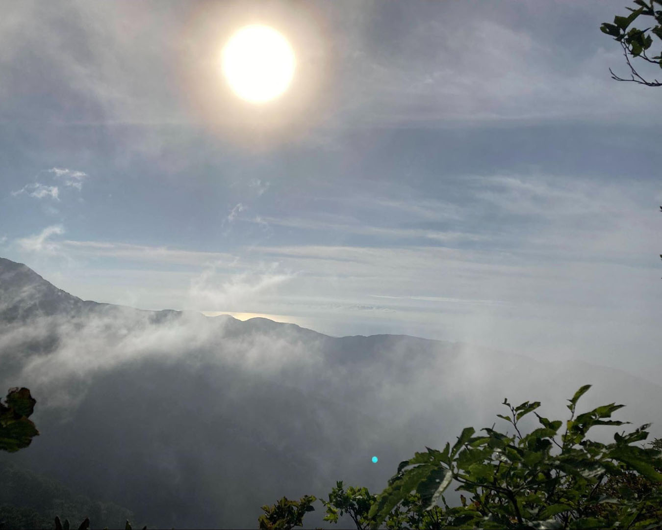 ガスの中、スタートまもなくして夜が明ける。本当に少しの間だけ見えた朝日に力をもらって気力をチャージ。