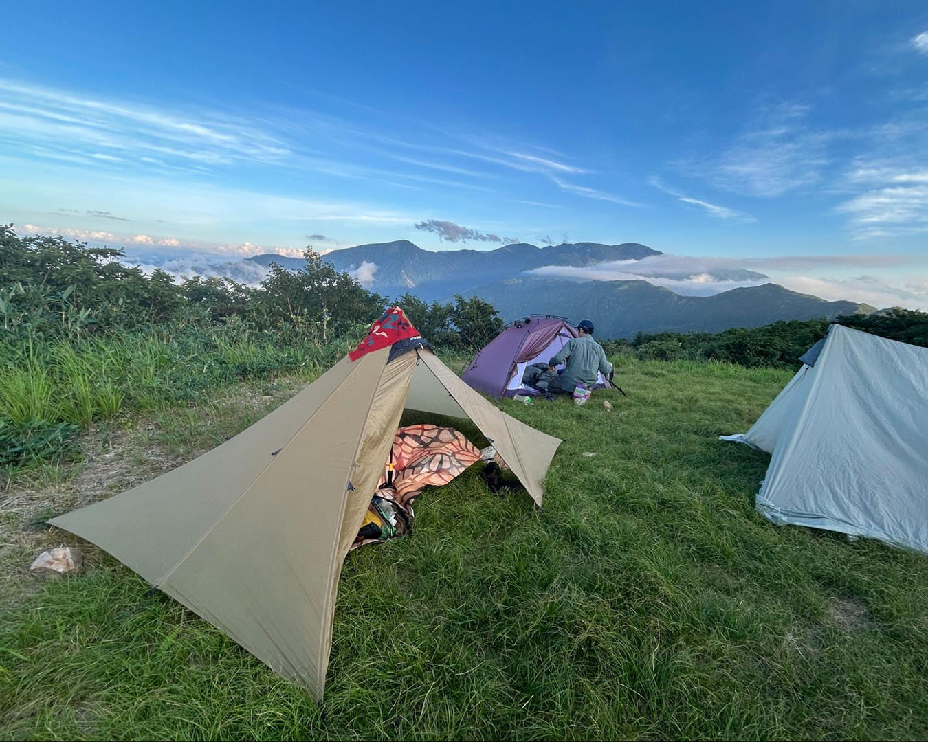 移動距離が最も長く、今回のメインとなる2日目の朝。出発予定4時30分に向けて3時30分起床。栂海山荘前のキャンプ場は平らでフカフカの草があり、まるで天然の絨毯のようで快適に眠れた。一方で気温は10℃以上はあり、就寝着にLight Alpha Tights、Alpha Socks、寝袋にモンベルのダウンハガー#3とSOLエスケープライトヴィヴィでは少し暑すぎるぐらいだった。