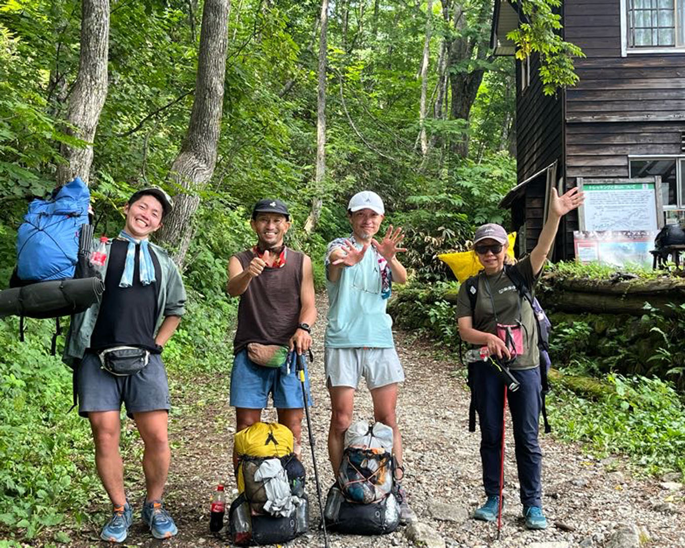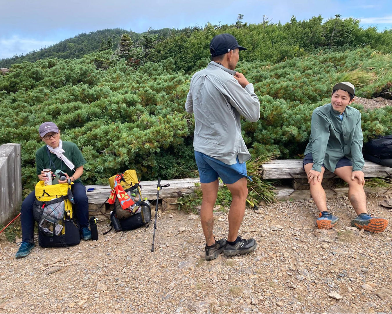 今回のPRACTICEでは朝日岳を越え、さらに後立山連峰の白馬岳まで目指すため、2日目には30kmを歩く計画を立てました。そんな深い深い山が続くハードなプログラムに参加してくれたのは、3名のハイカー。計画の遂行にUL化は必須のため、参加者にはベースウェイト4kg以下で準備を進めてもらいました。