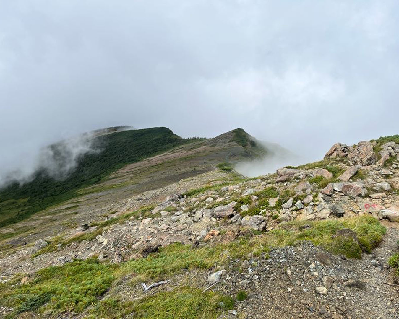 先行のギジさん、陸さんの姿は霧の中。次のみんなとの合流は雪倉岳だが、霧で視界はほぼなし! 白い世界を歩く歩く! 時折見える雪倉岳までの長い長い急登! とにかく前へ前へ。