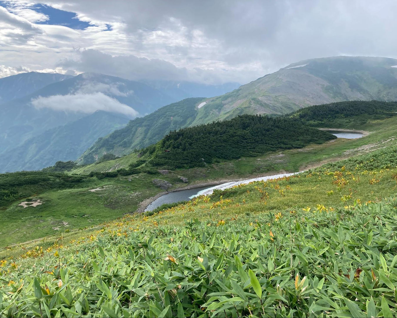 適度なアップダウンがある尾根道を、青空と雪渓に迎えられて黒岩山までは快適なハイキング。メンバーのハルさんの黄色いTHREEが見えたり消えたりを追いかけて、黒岩平の高山の花々、池塘を見ながらゆっくりと進む。昨日の樹林帯地獄とはまるで違うメルヘンの世界が広がる。