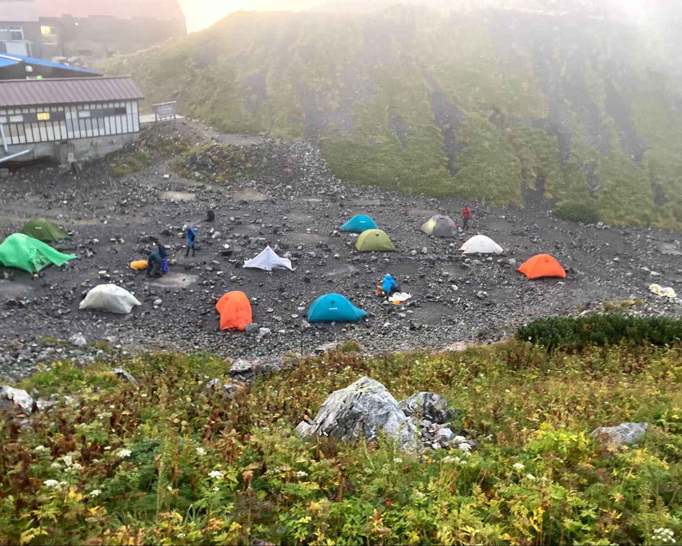 白馬岳頂上宿舎のキャンプ場は稜線上にあり、台風が近づいている影響で風も強かった。夜中の間ずっと吹き続けた風の風速は平均で10m/sほど、突風時は20m/sだったとか。