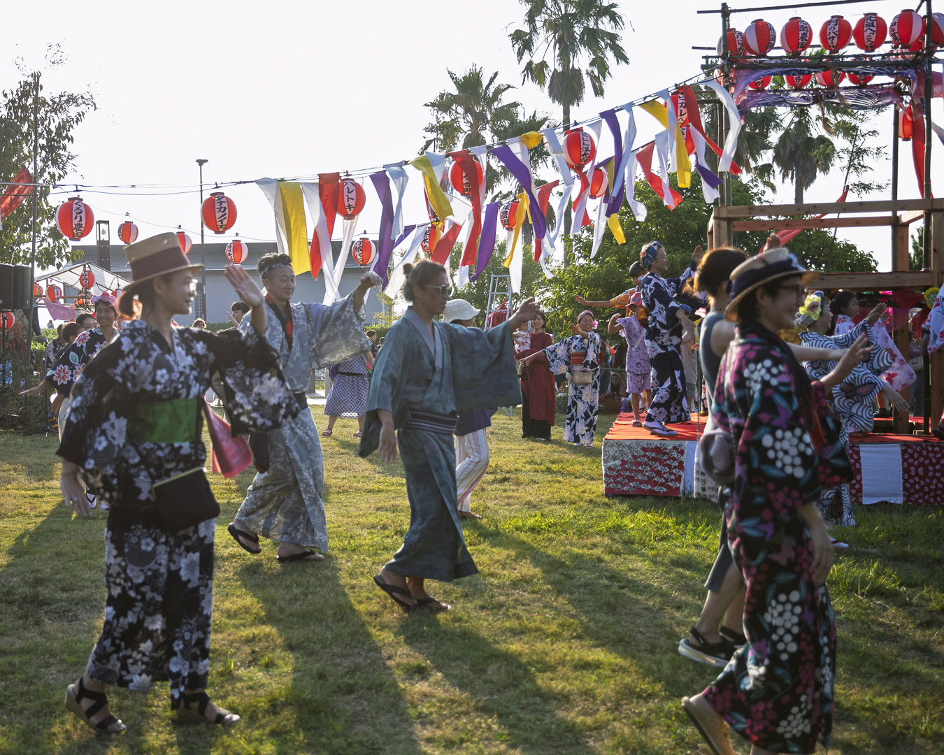 「皆で一緒に踊ることができる盆踊りの振り付けの型が、大きなポイントなんです。型のおかげで、踊りのうまい下手ということは関係なく、ただ踊るだけでそこにいる人同士が同調していくことができるんです」と笛里子さん。振り付けの多くは少しの練習で覚えられ、輪になって踊ることで人々がつながり、大調和が生まれる。そして、音楽と踊りが完全にシンクロしていなくても、不思議と調和するのだ。