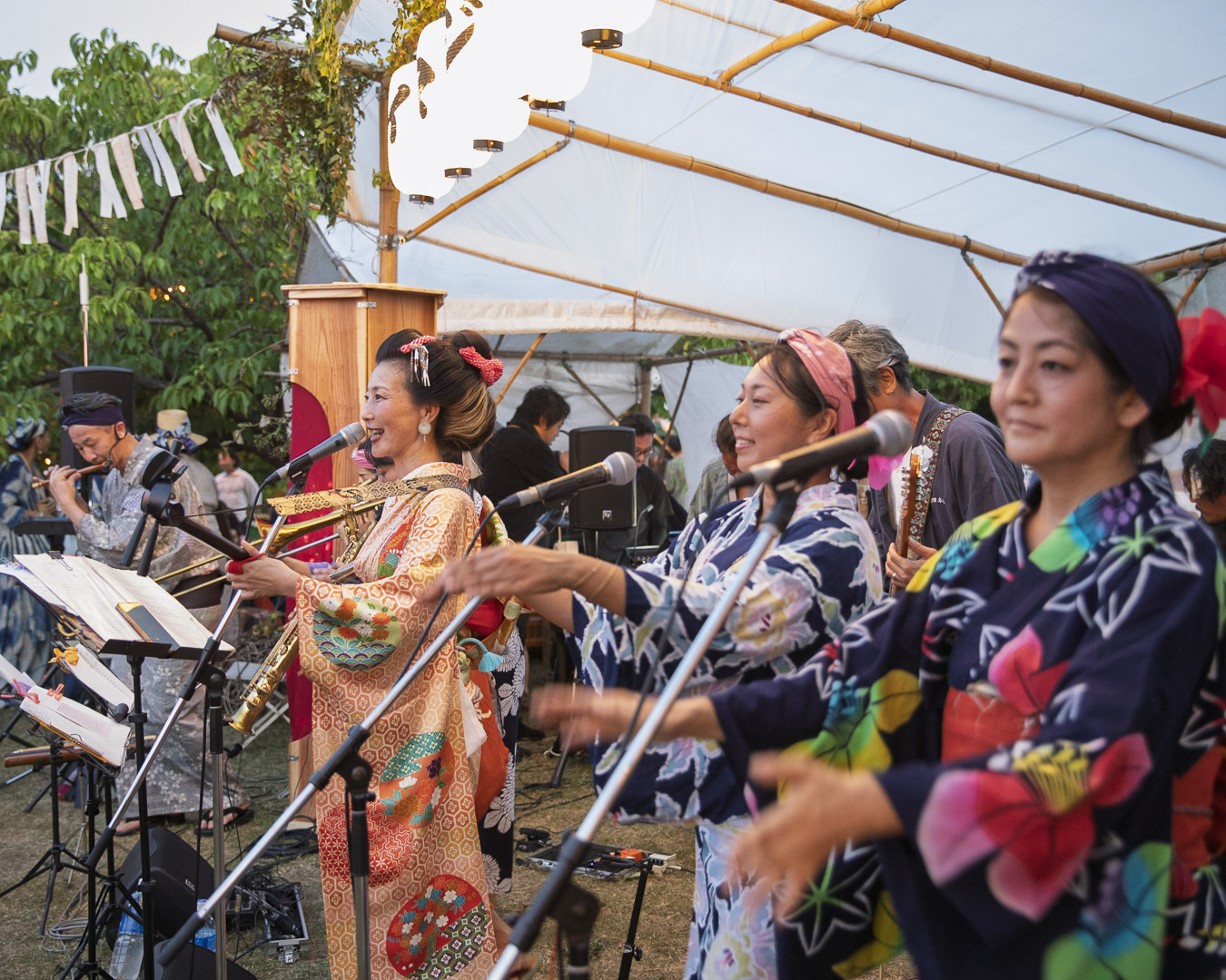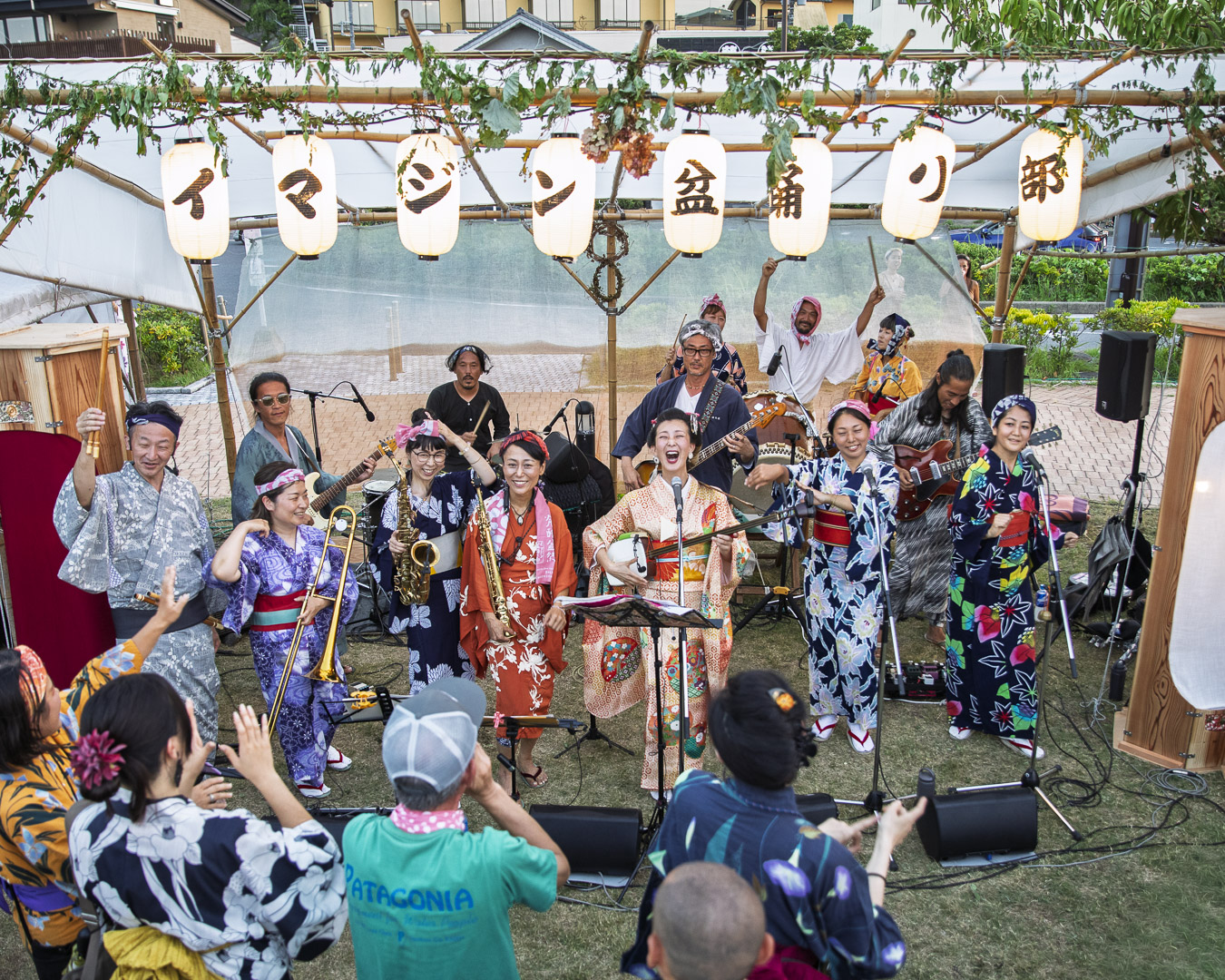 生歌、生バンドで音頭を演奏し、踊り子も含めたメンバーは現在総勢40名以上。ひとたび演奏と踊りを始めれば、そこを祝祭の空間としてしまう盆部。『山道祭』にも、2019年の初回から祭りの欠かせない要素として出演し、毎回、会場を笑顔と踊りの坩堝にしてもらっている。