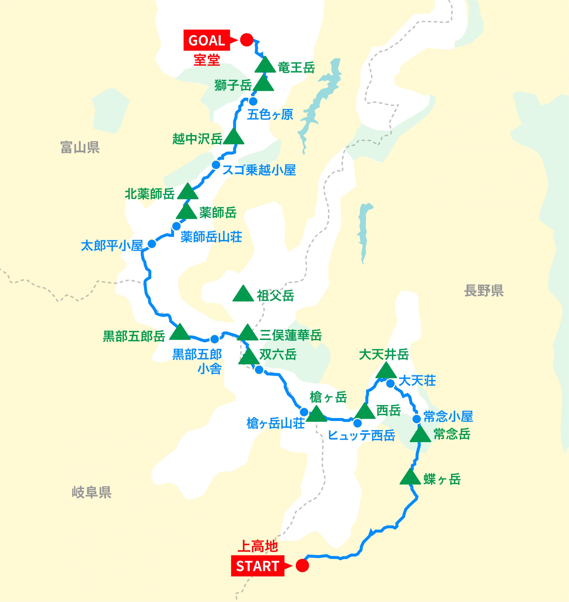 今回歩いたルート。上高地から出発し、表銀座〜裏銀座〜立山連峰を縦走して室堂を目指す。