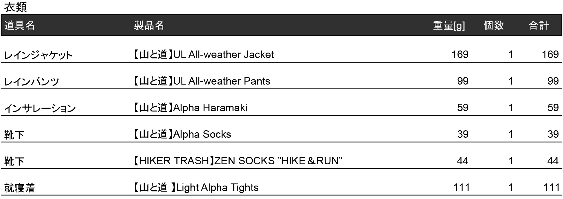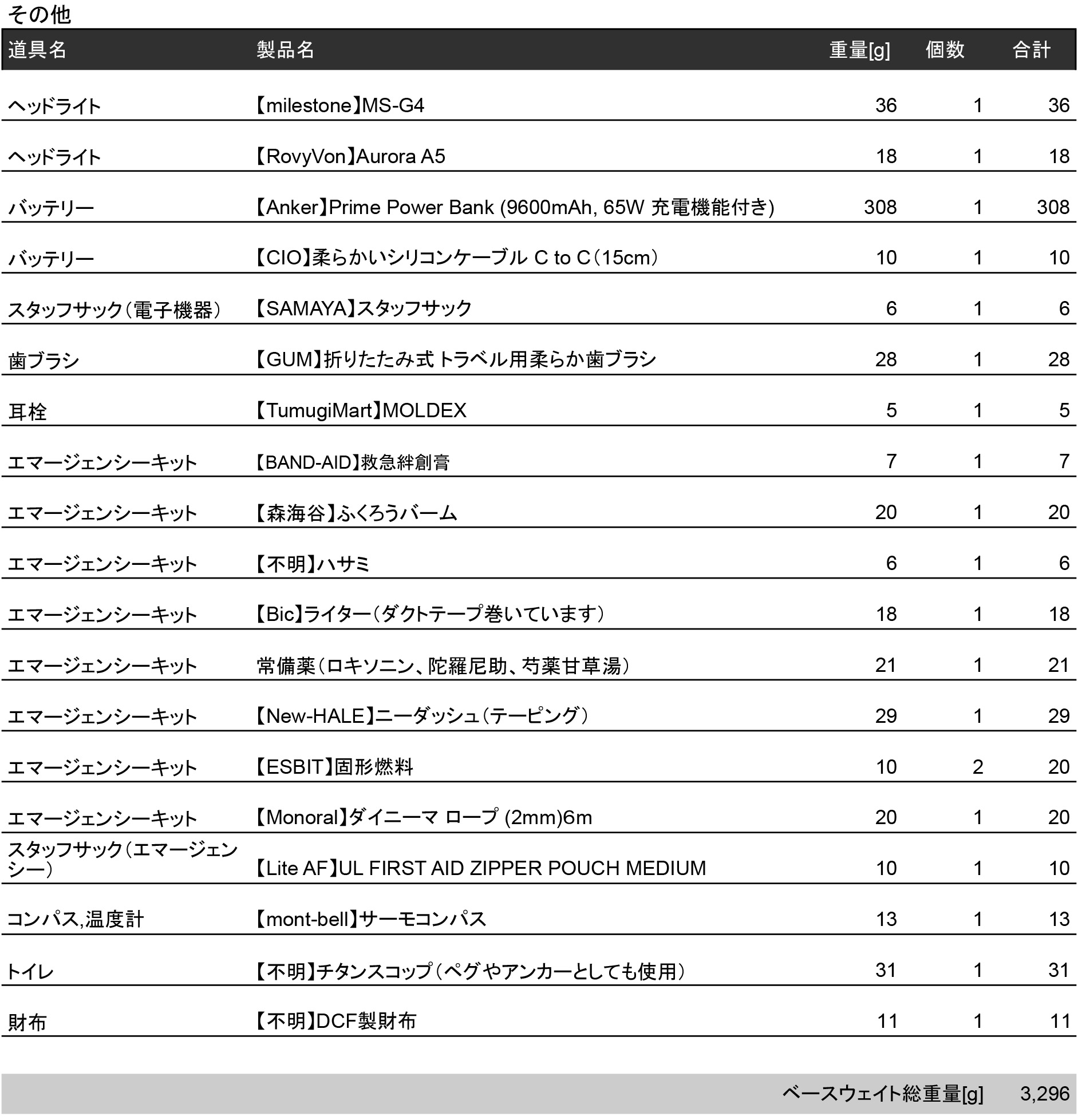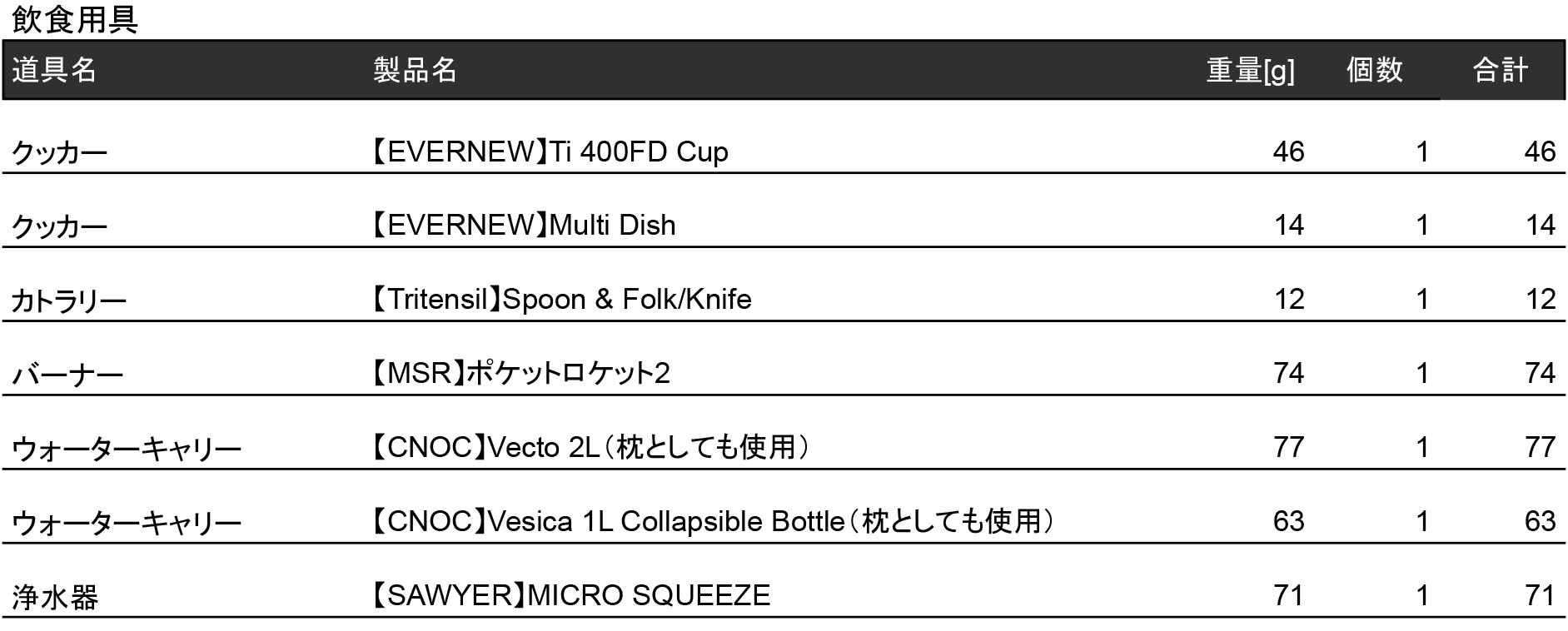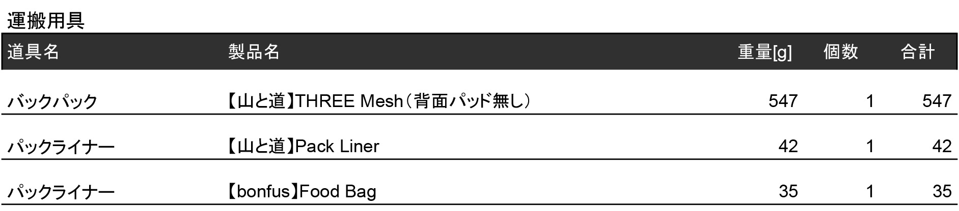 *水・食料・燃料以外の装備を詰めたバックパックの総重量