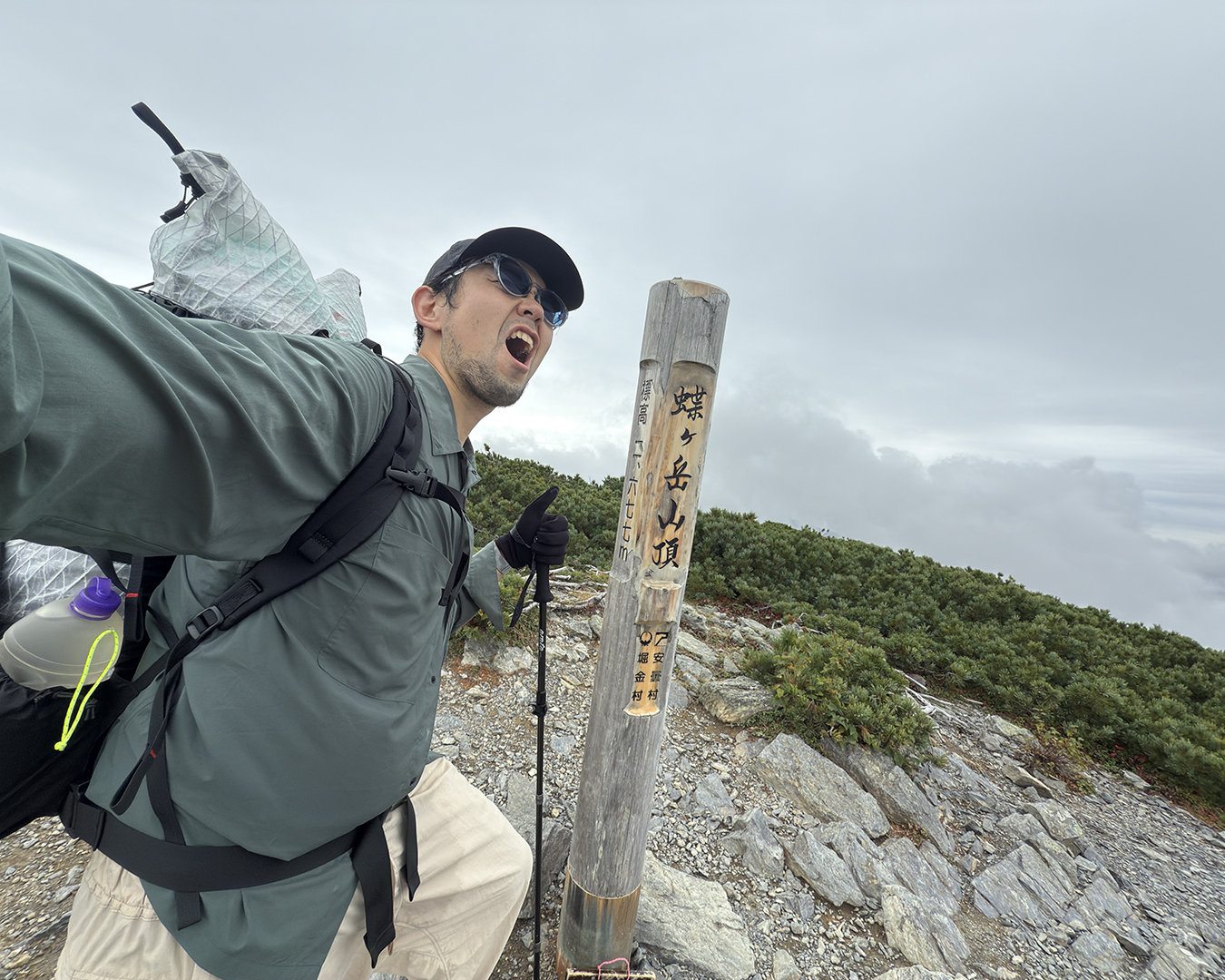 早速、エネルギー切れを起こさないようにUL Big Pocket Shirtの胸ポケットに入れた大粒ラムネをポリポリ食べながら、登りやすい樹林帯の道を、自分の体力を確かめながら一歩一歩登っていく。とはいえ、調子に乗って歩みを速めるとへばってしまうので、心拍数を意識しながらペースを保つ。無事に蝶ヶ岳へ到着。