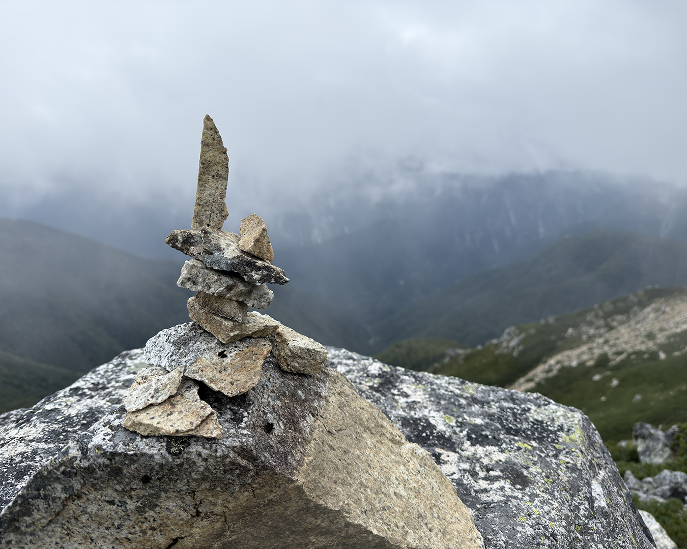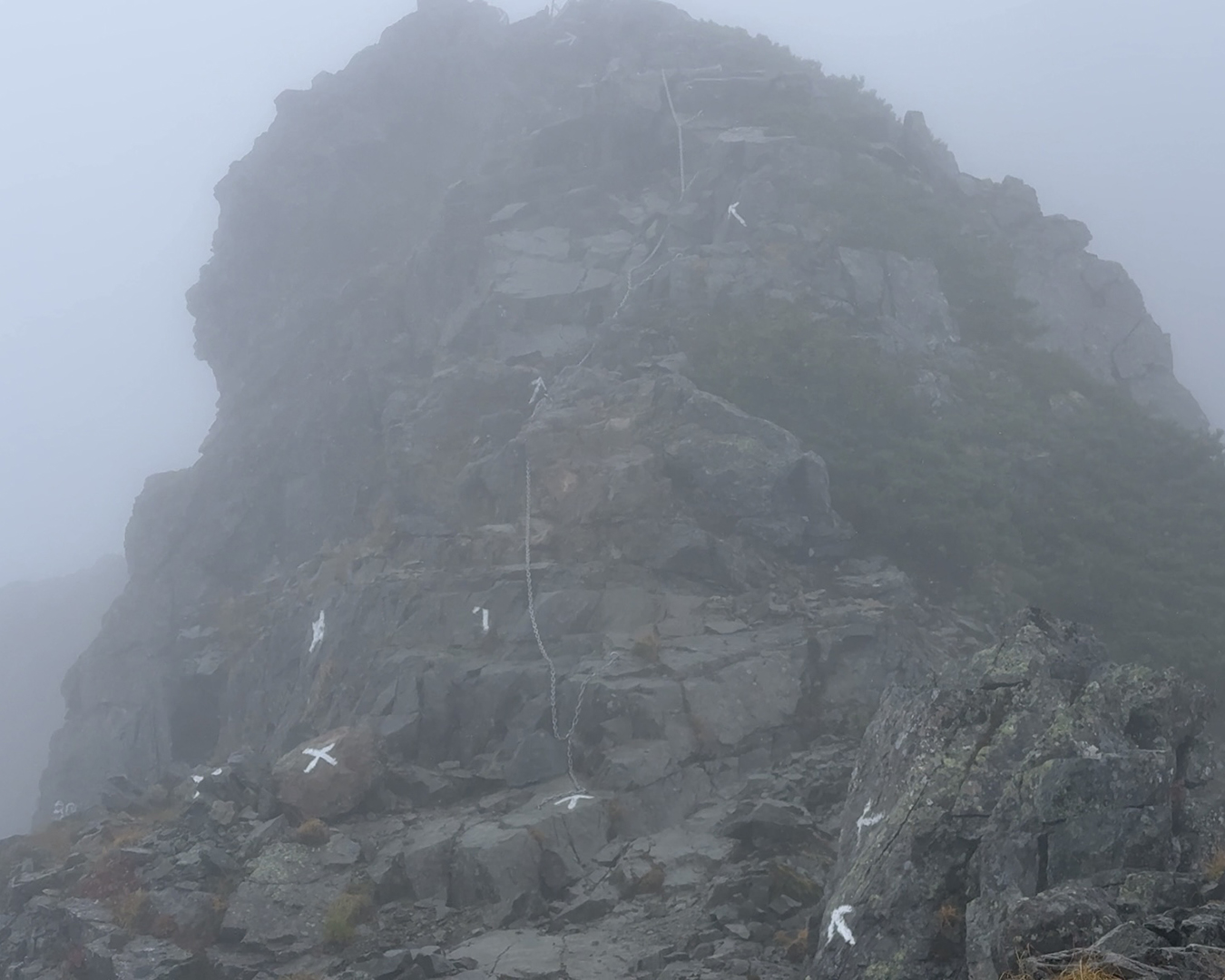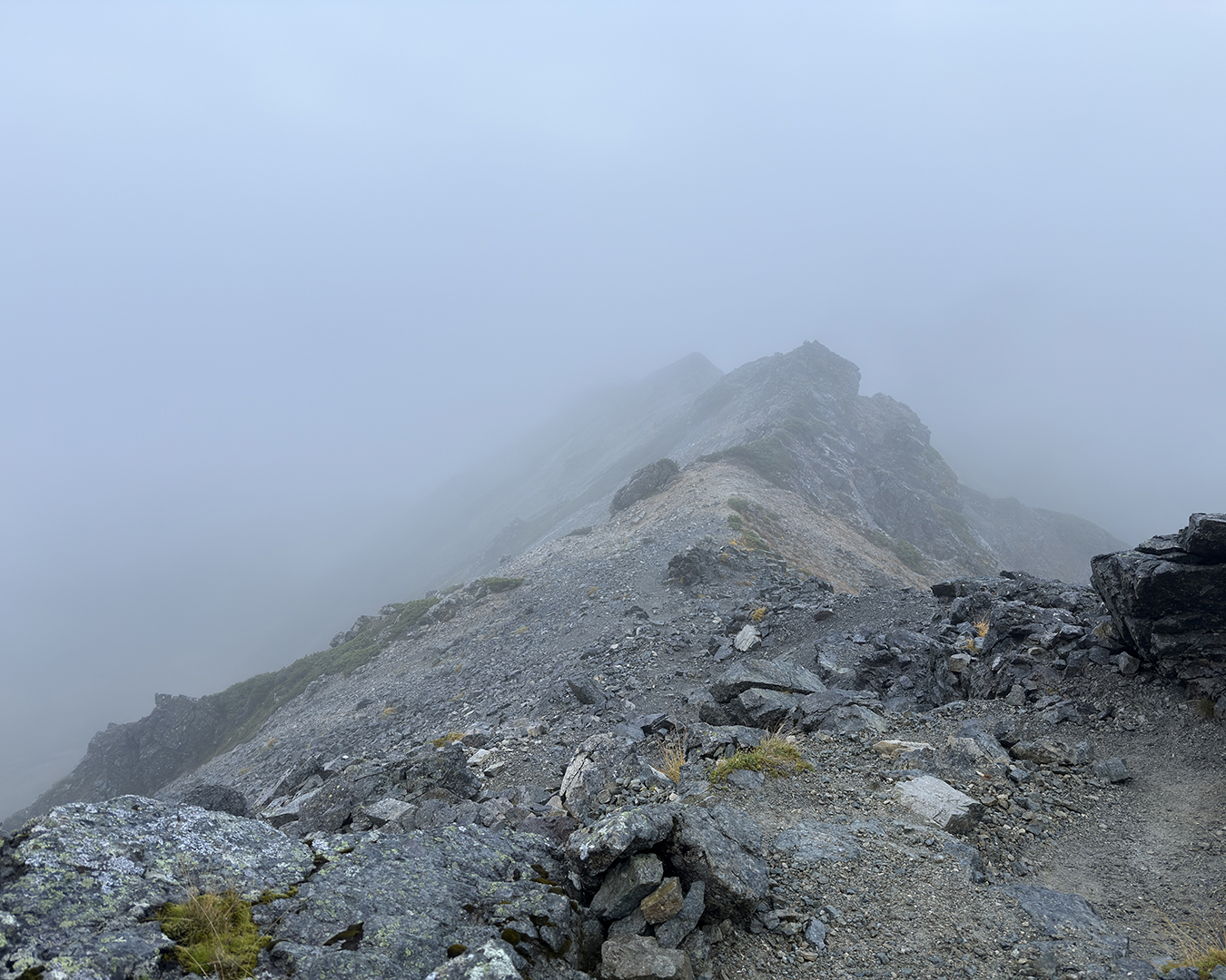 自分のペースでハイキングができていることに喜びを感じつつ、次の目的地である常念岳へ向かう。しかし喜びも束の間、常念岳に差しかかるとゴロゴロとした岩場が続き、目印を探しながらの難儀な登りとなった。苦労の末、ようやく常念岳の山頂へ辿り着いた頃には、あたりはガスに包まれ視界が白く霞んでいた。