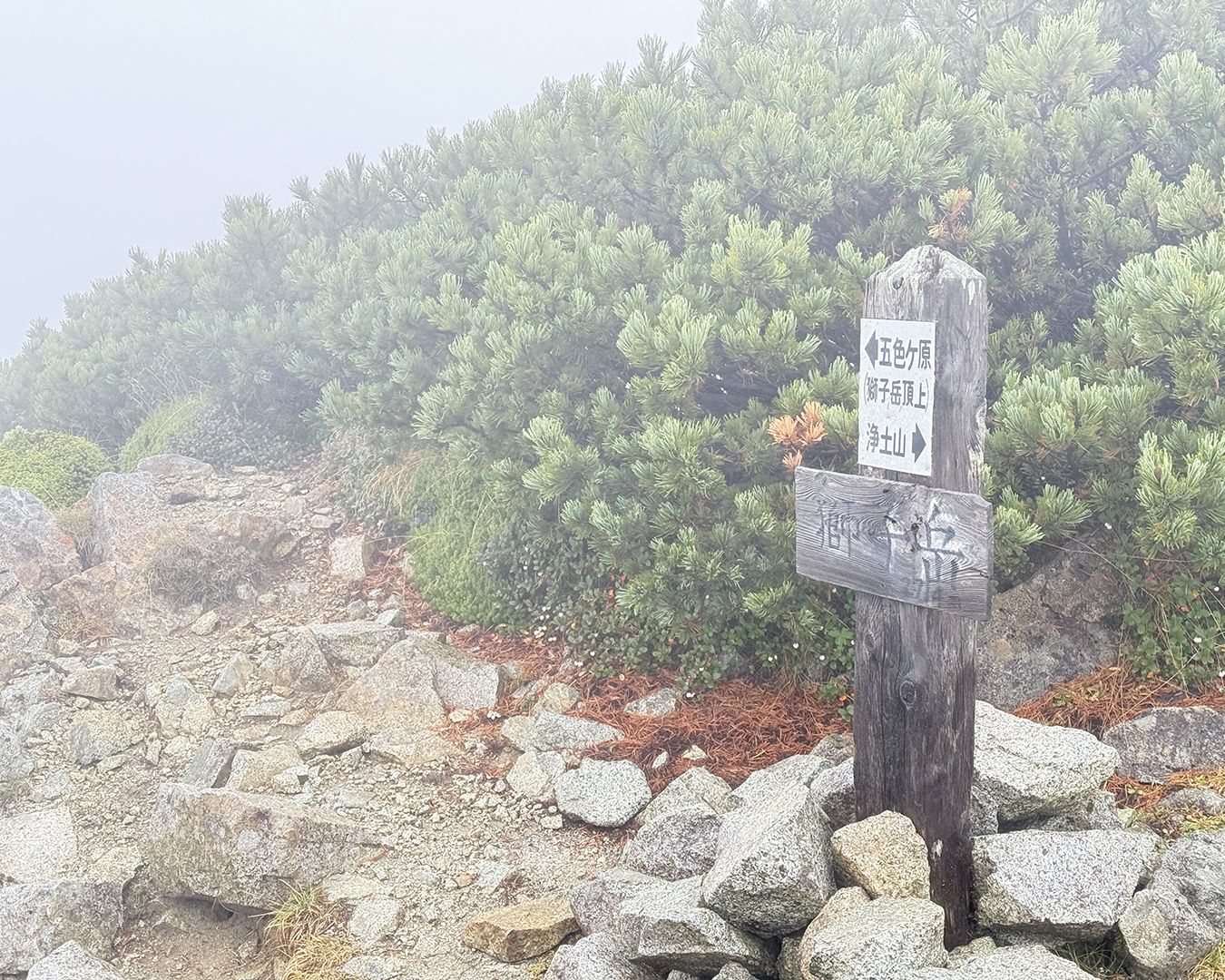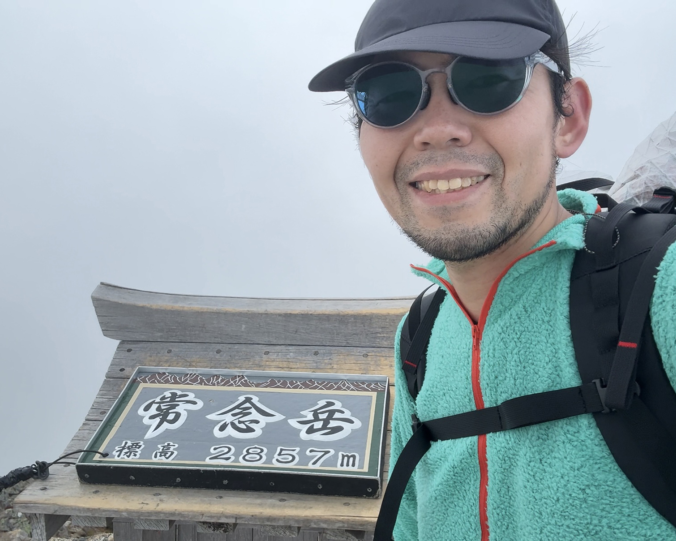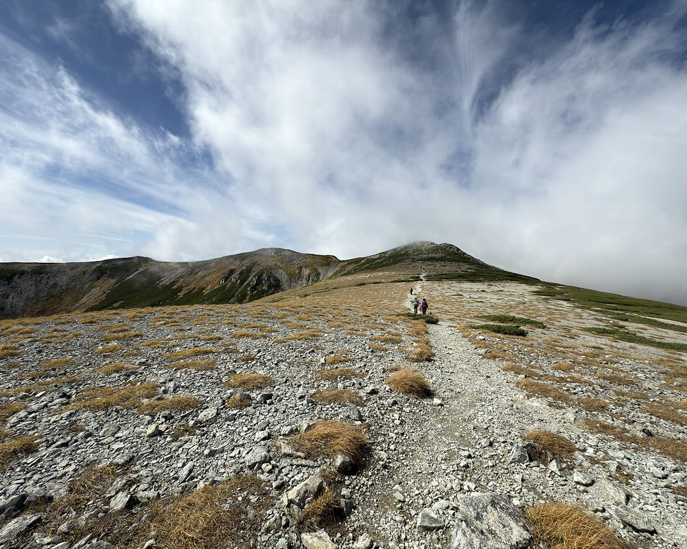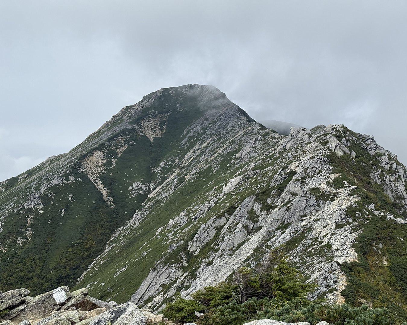 自分のペースでハイキングができていることに喜びを感じつつ、次の目的地である常念岳へ向かう。しかし喜びも束の間、常念岳に差しかかるとゴロゴロとした岩場が続き、目印を探しながらの難儀な登りとなった。苦労の末、ようやく常念岳の山頂へ辿り着いた頃には、あたりはガスに包まれ視界が白く霞んでいた。