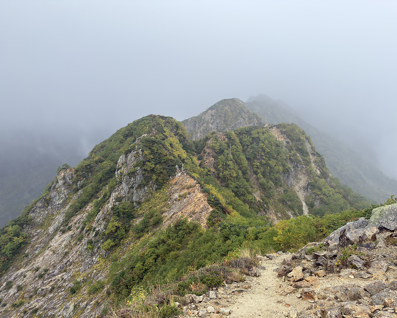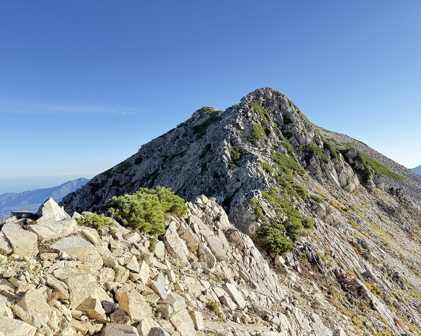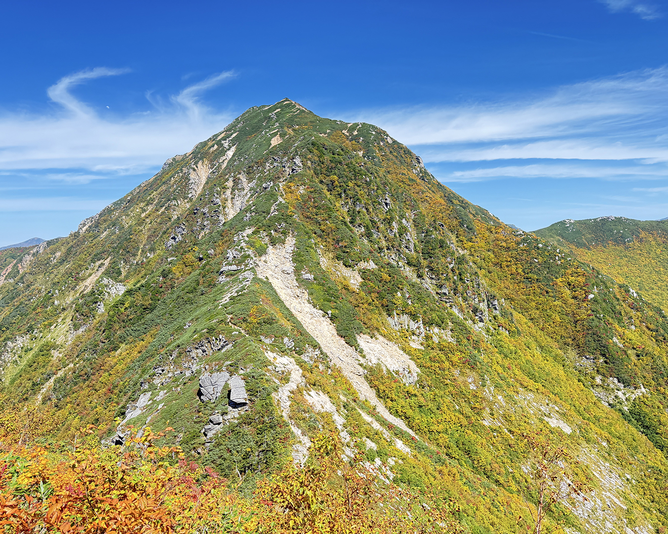 その後も登っては下るの繰り返し。極めつけは越中沢岳だ。地図ではさほどきつそうに見えなかったが、実際に登るとこれがなかなかの急登。途中、ザレ場で足をかけた岩がズルッと動きヒヤリとしながらも、無事に山頂へと辿り着いた。