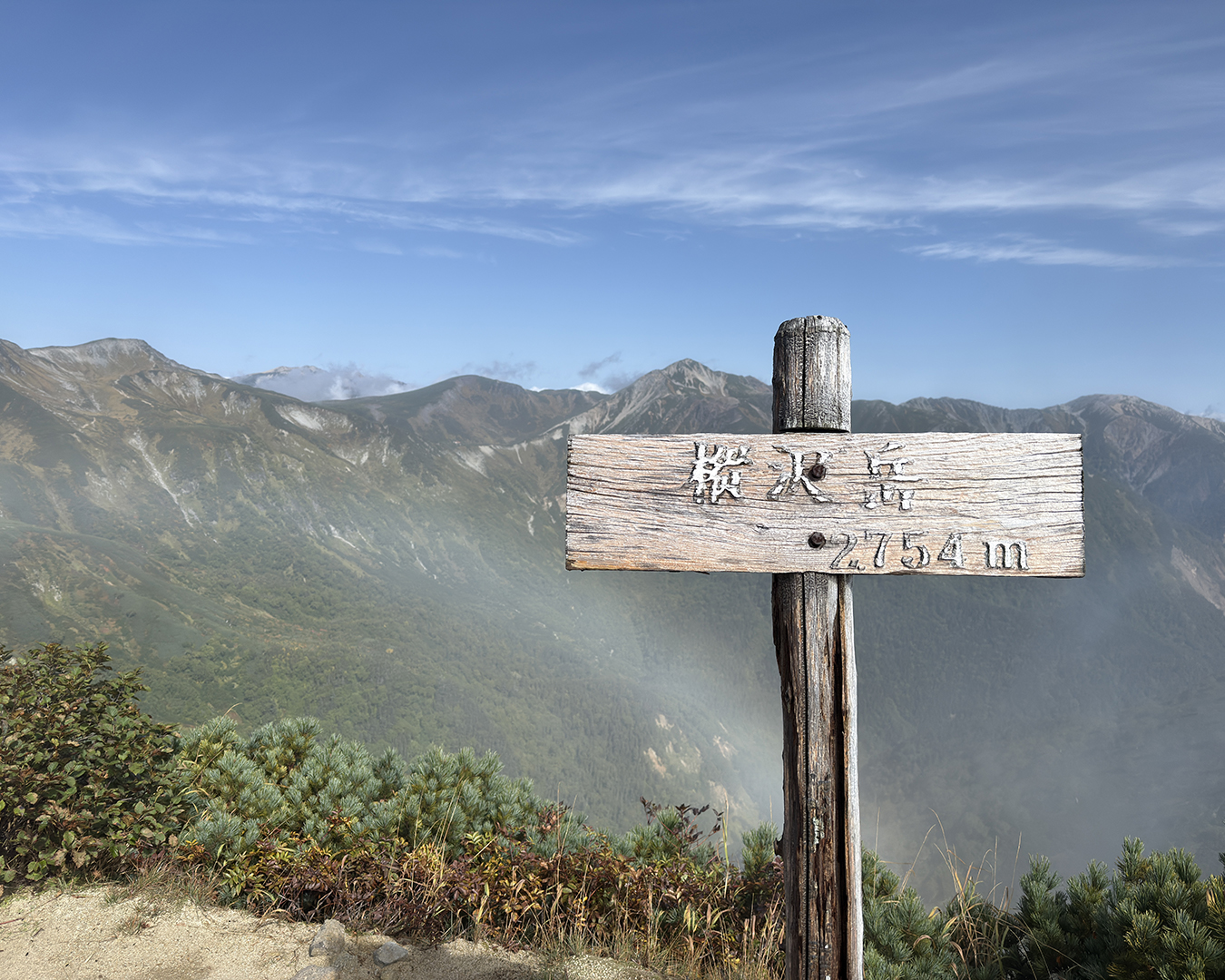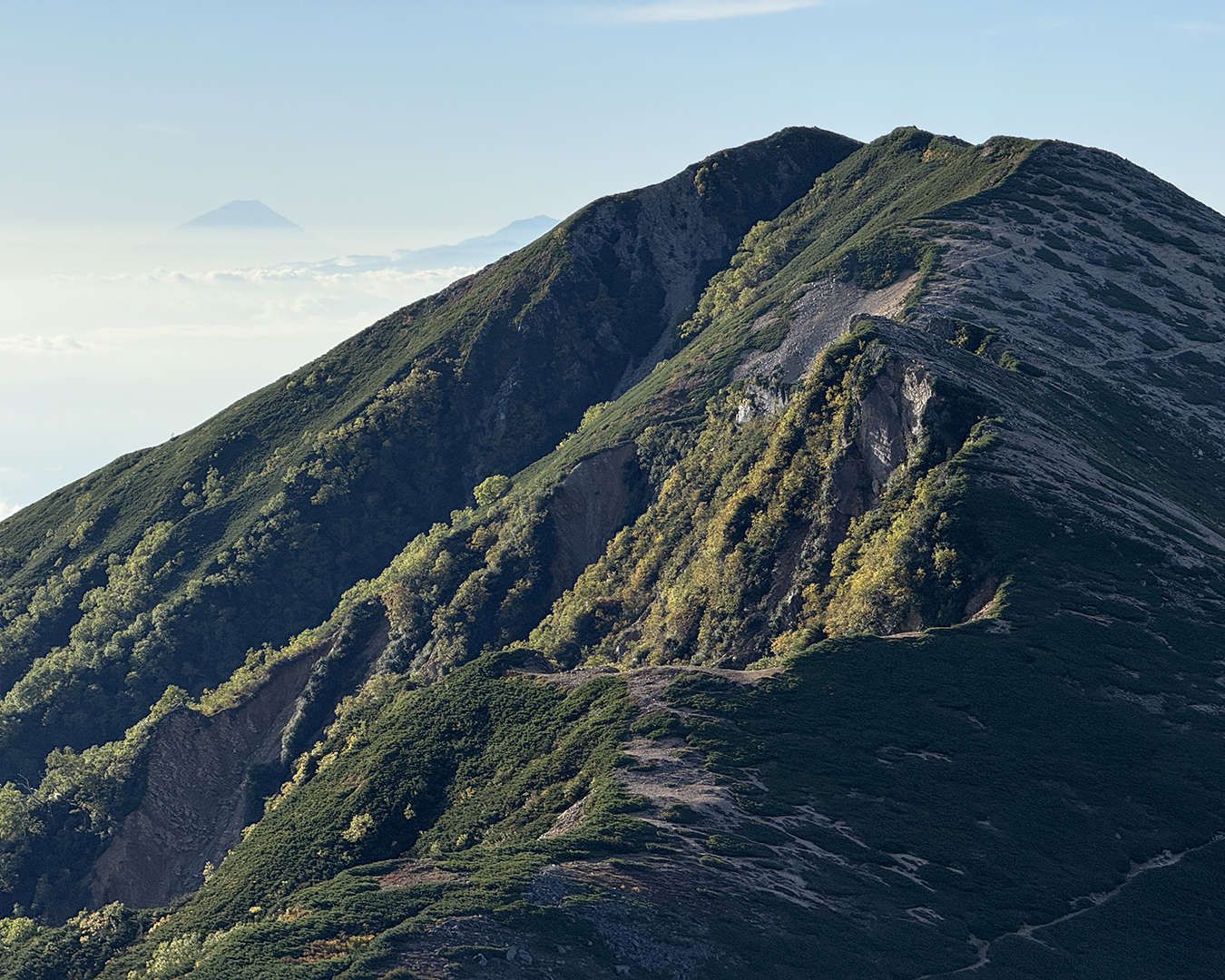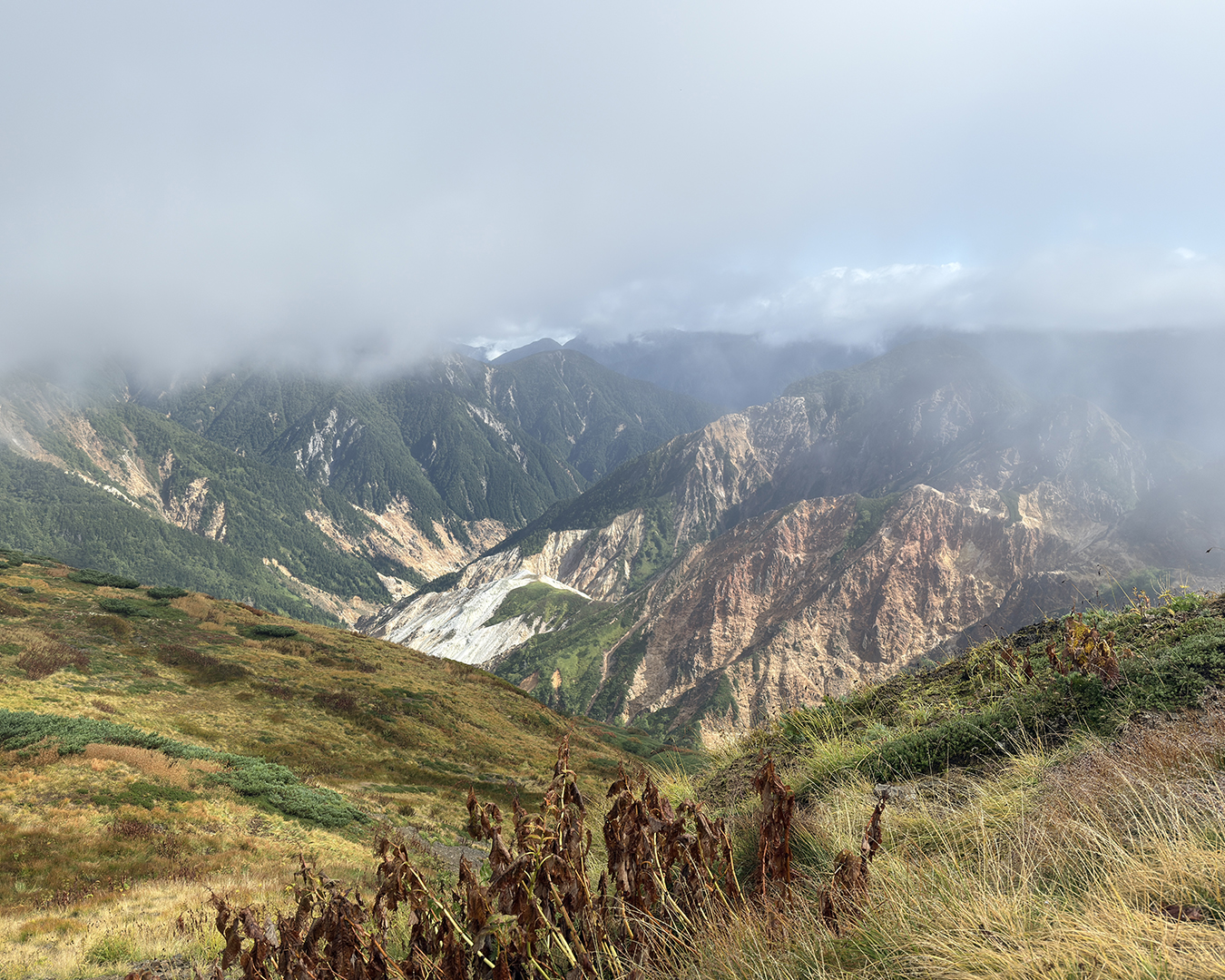 その後も登っては下るの繰り返し。極めつけは越中沢岳だ。地図ではさほどきつそうに見えなかったが、実際に登るとこれがなかなかの急登。途中、ザレ場で足をかけた岩がズルッと動きヒヤリとしながらも、無事に山頂へと辿り着いた。
