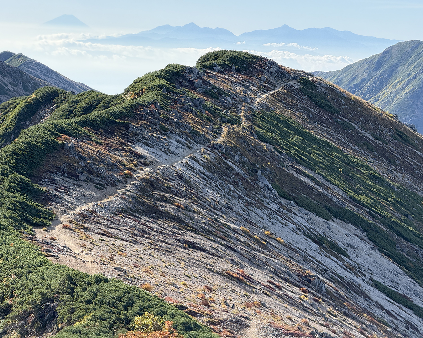 慎重に西鎌尾根を進む。レイヤリングが見事に機能し、強風の中でも冷えを感じることなく快適に行動できた。やがて風が次第に弱まり、胸を撫で下ろす。久しぶりに歩きやすいトレイルと晴れ間が戻り、自然と心が弾む。膝の痛みも悪化せず、むしろ慣れてきたように感じた。