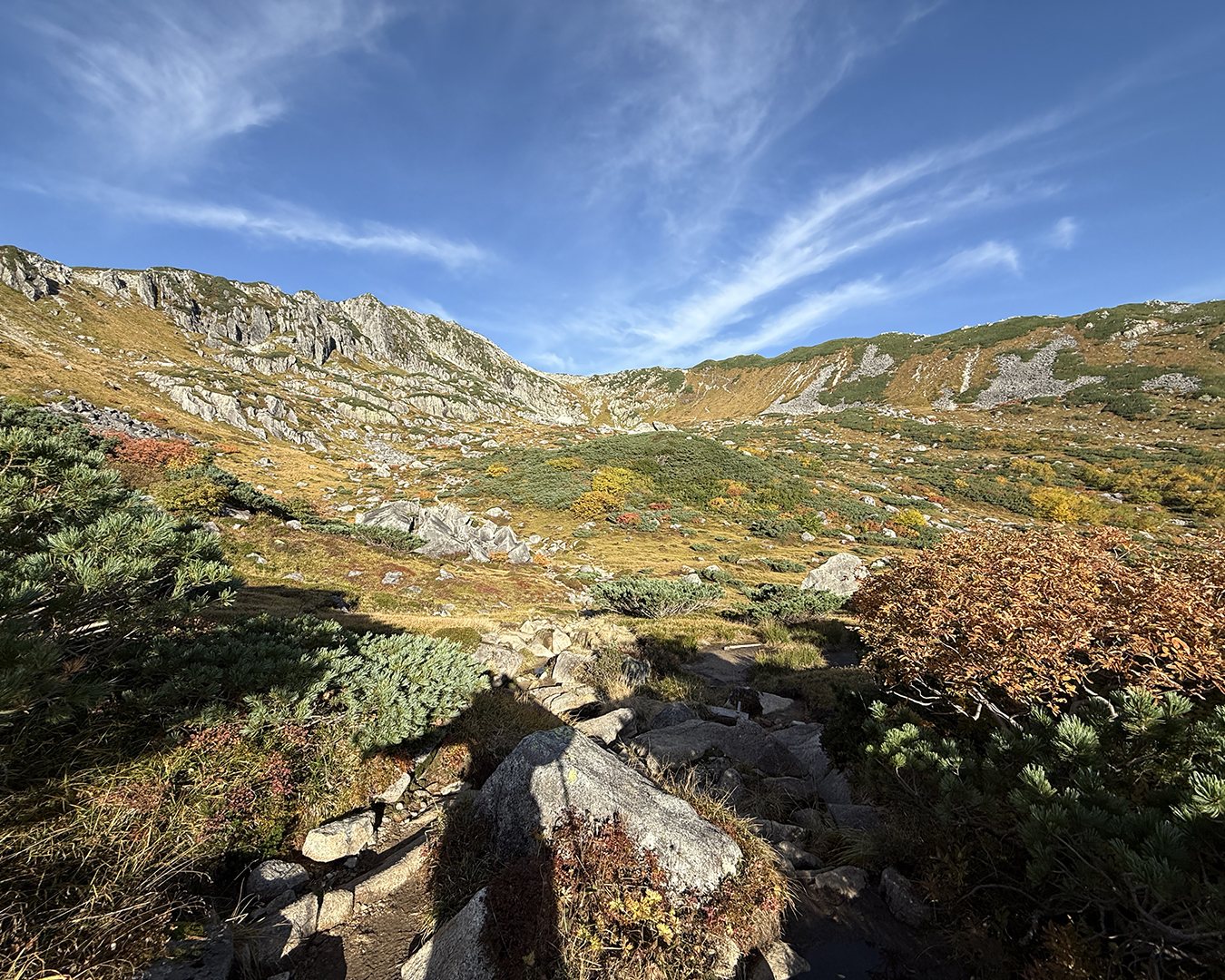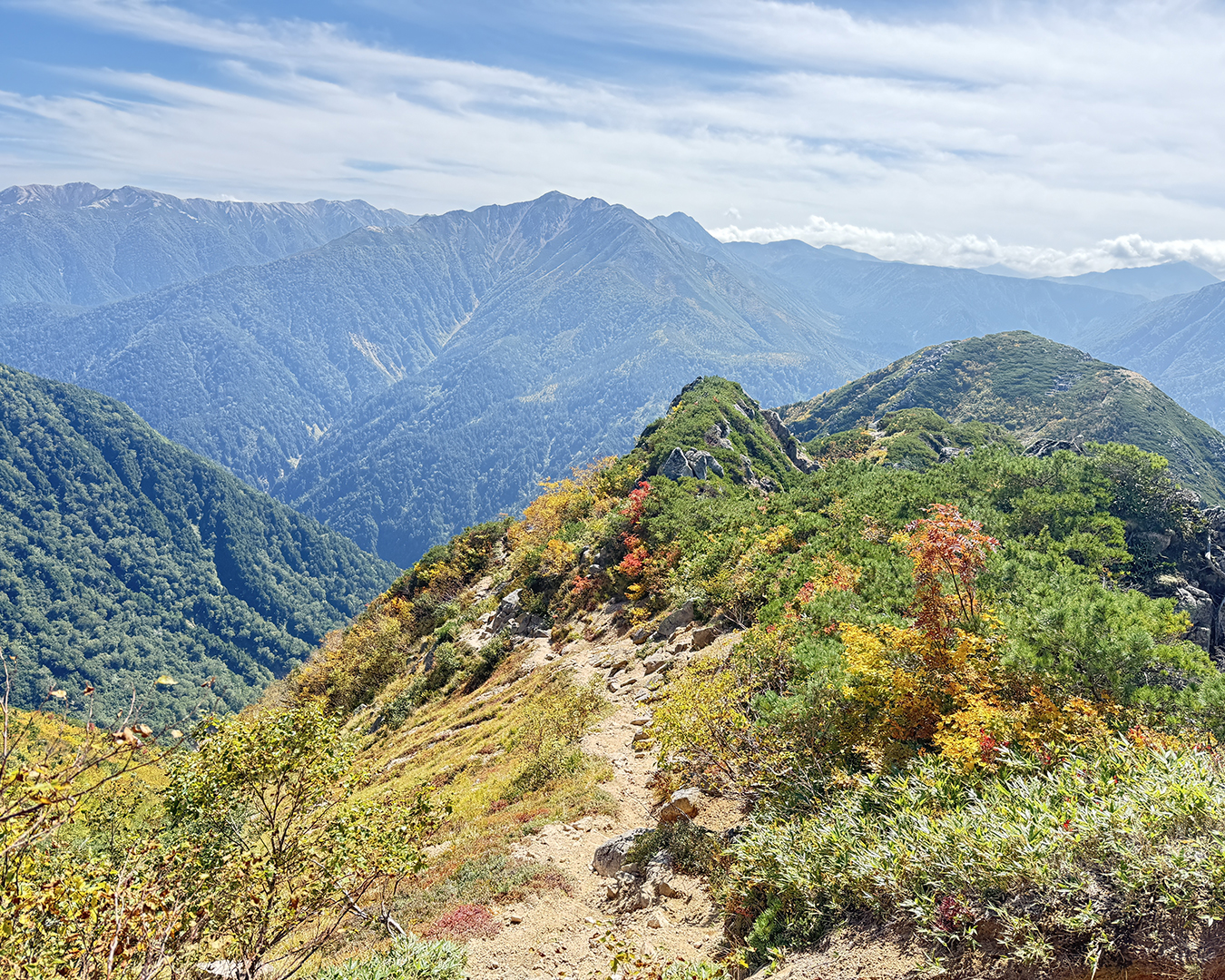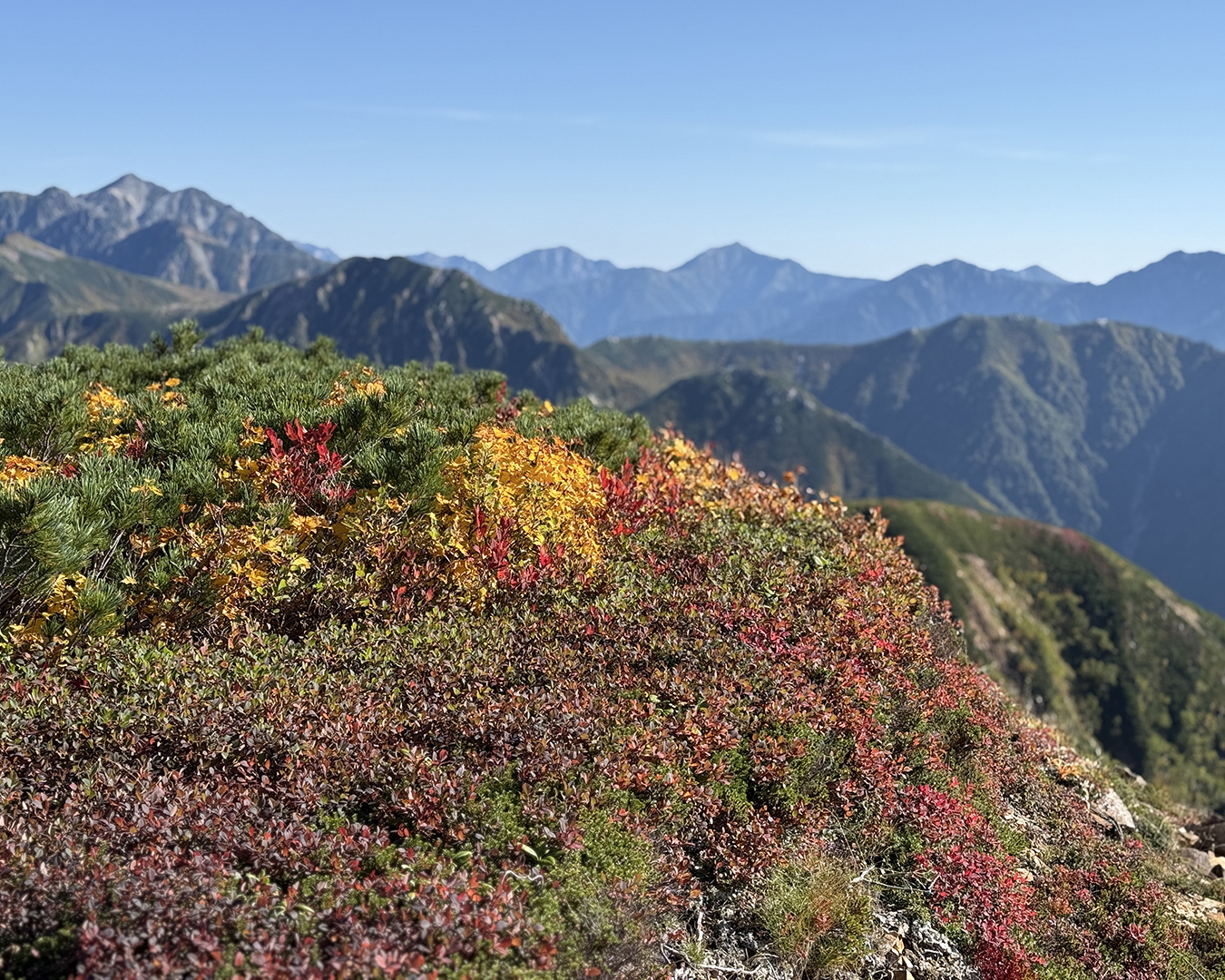 この日はなかなかアップダウンが多い1日だった。薬師岳まで登ると、そこからは苦手な岩場が続く。とはいえ、少しずつ岩場にも慣れてきており、常念岳の時のように焦ることもない。確実に成長している自分を感じる。北薬師岳を越える頃には、見事な紅葉が広がり、その美しさに思わず足が止まった。